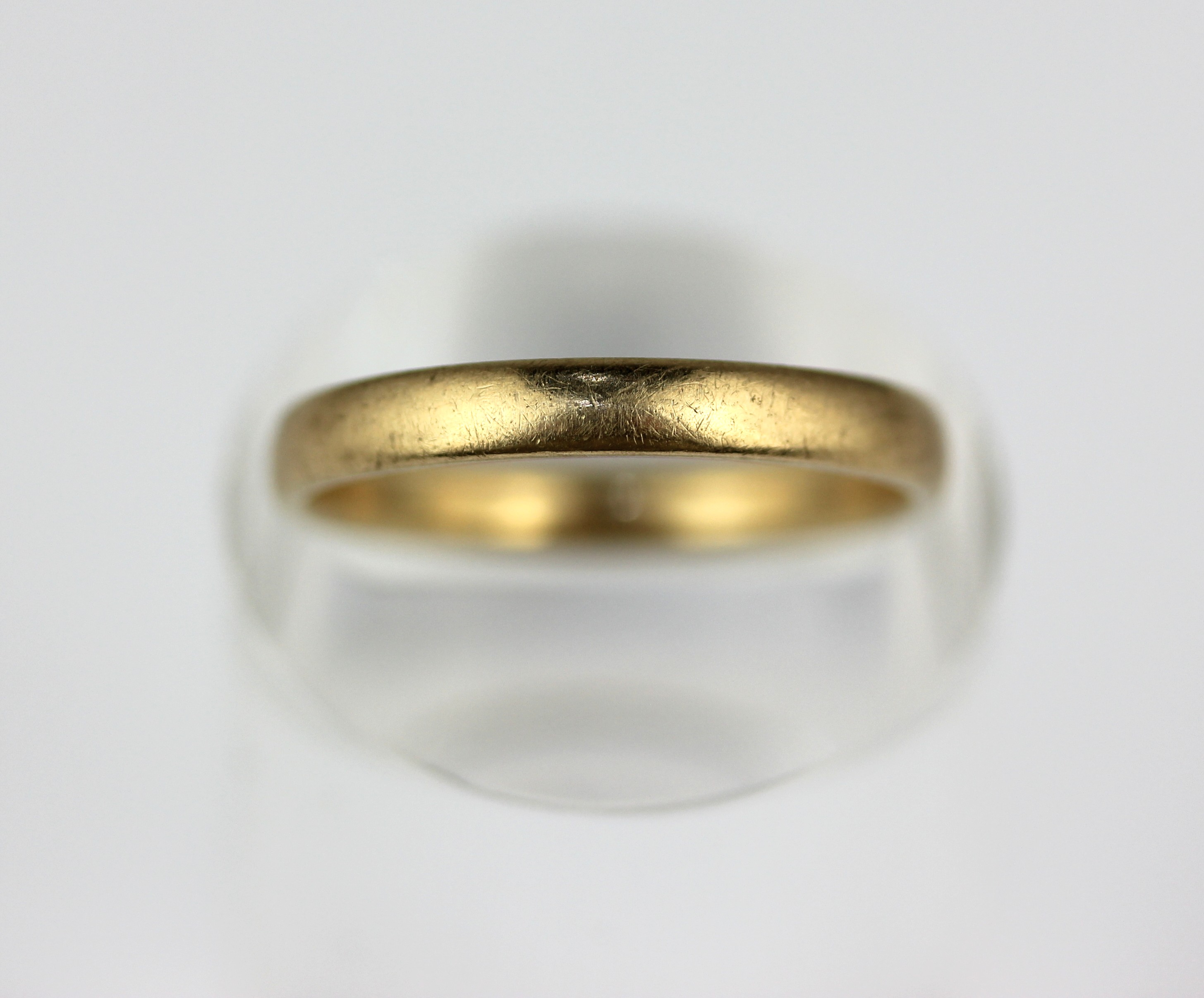 A 9ct gold plain wedding ring, London 1990, size P1/2, 2.4g, with a case