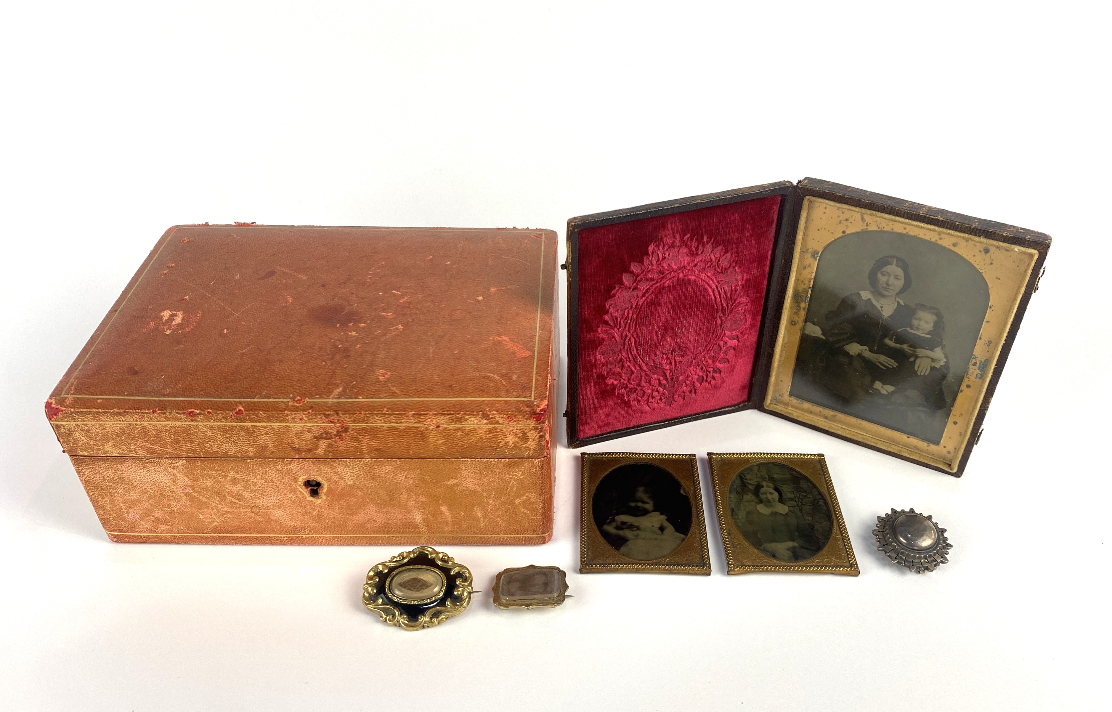 A Victorian gilt metal and black enamelled mourning brooch two Victorian brooches, a Daguerotype photographic image of a lady with a child, in a folding frame, two further photographic images and a red jewellery box
