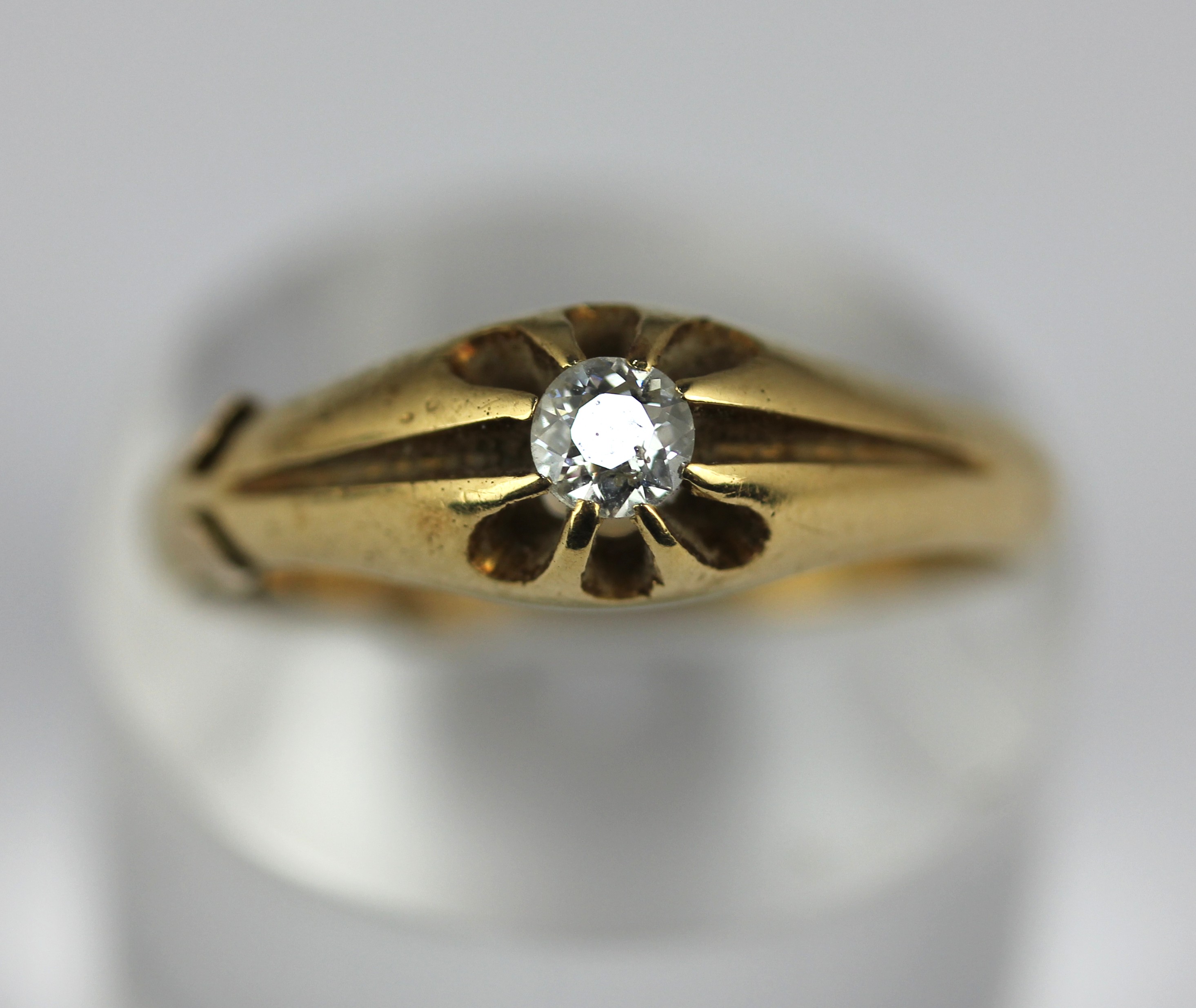 A gentleman's 18ct gold and diamond single stone ring claw set with a cushion shaped diamond, London 1915, with a 9ct sizing band, ring size T, gross weight 5.3 gms