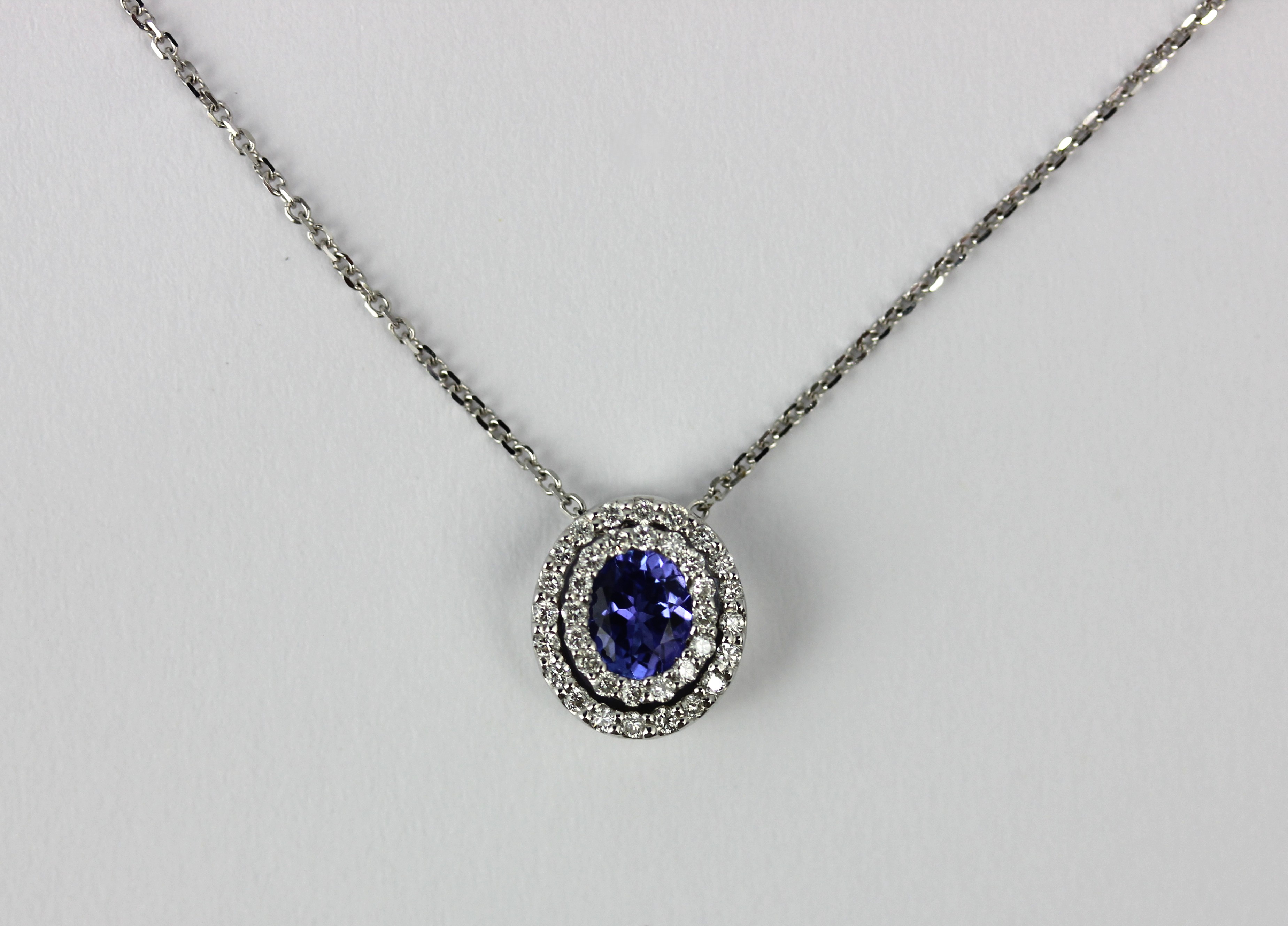 A 9ct white gold, tanzanite and diamond pendant mounted with the oval cut tanzanite in a two tear surround set with small circular cut diamonds on a 9ct white gold neck chain, length of chain 40cm gross weight 2.2g