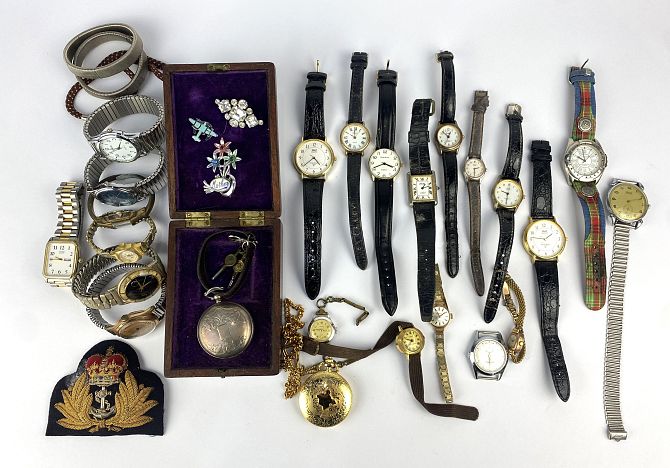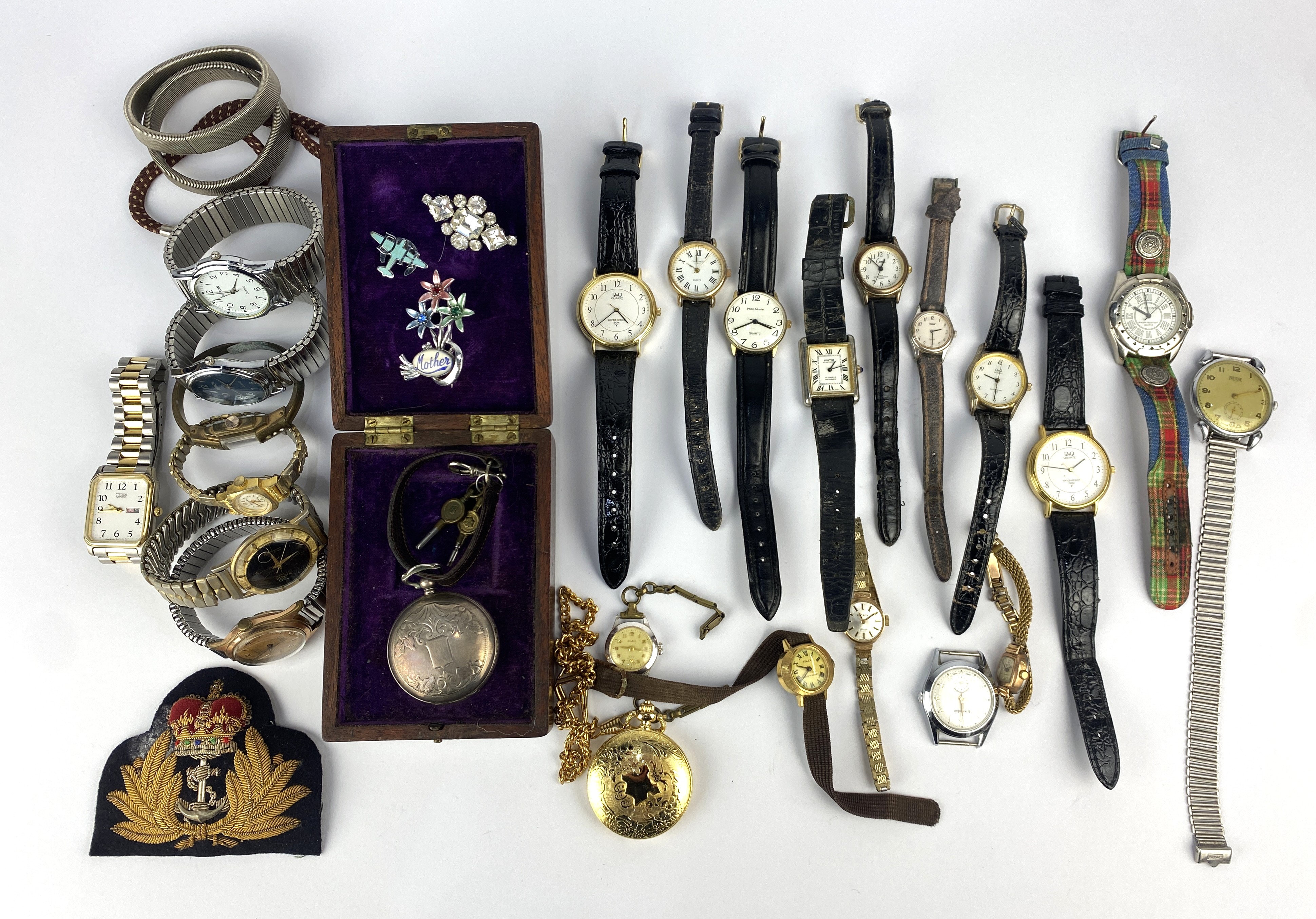 A Chirket key wind hunting cased Turkish market fob watch, the case detailed 0,800, with two keys and a wooden box, a group of gentlemans wristwatches including Prestige and Roamer, a Naval Officer's hat badge and a few further items