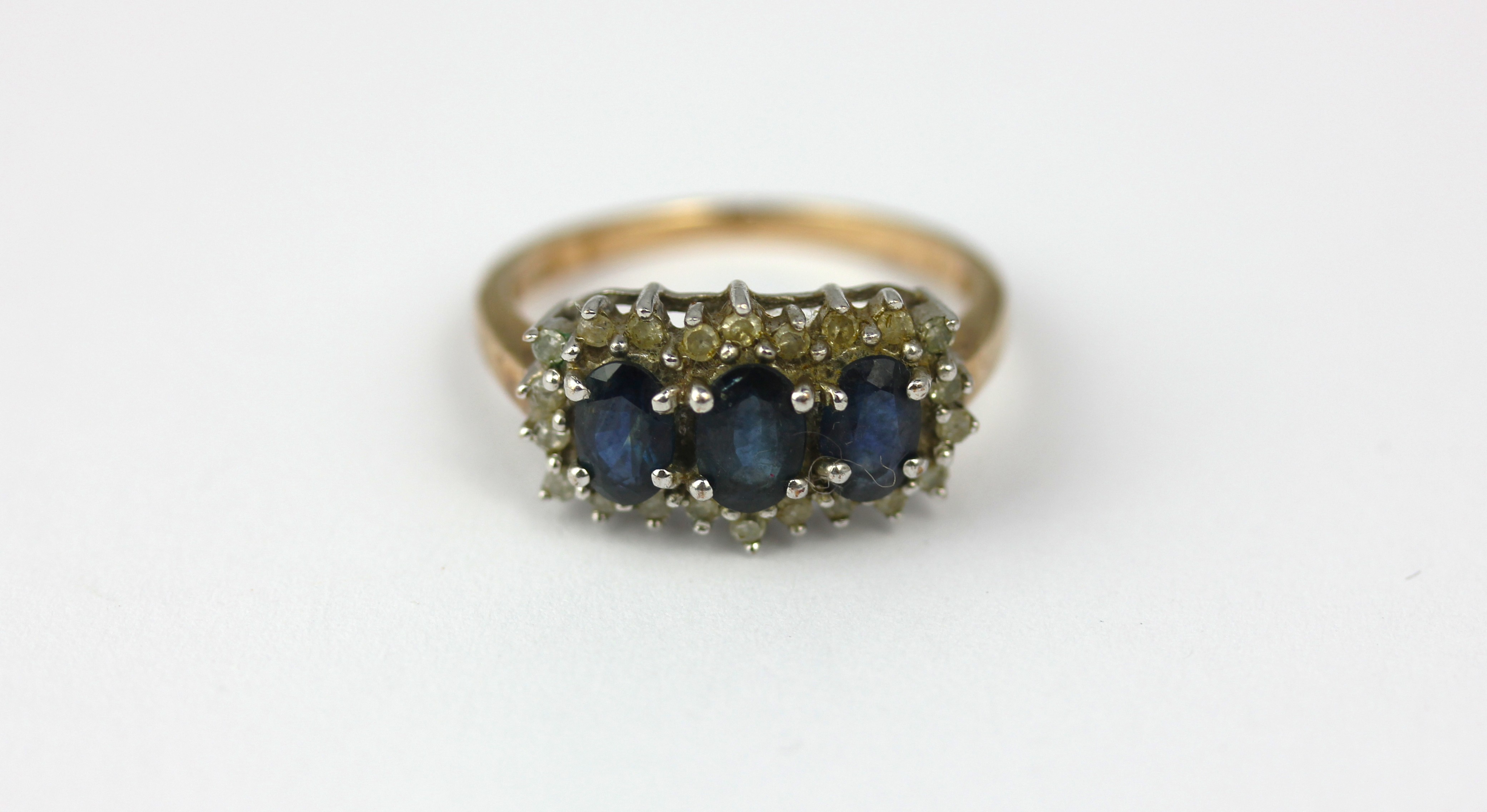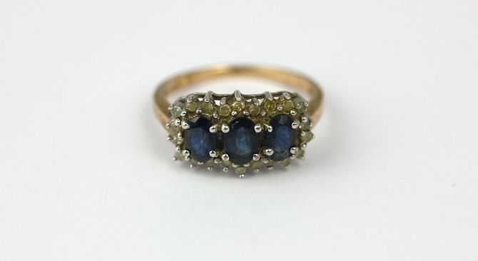 A 9ct gold, sapphire and diamond ring, claw set with three oval cut sapphires within a surround of circular cut diamonds, size P, gross weight 3.5g