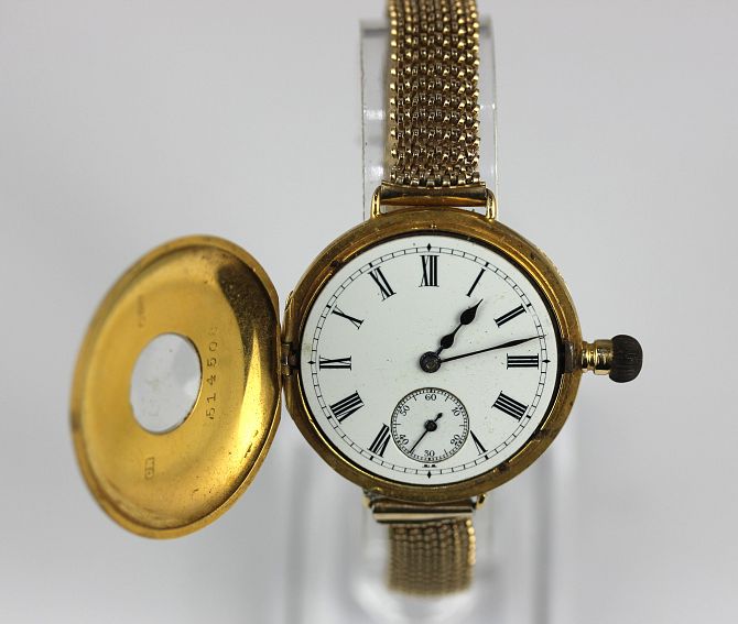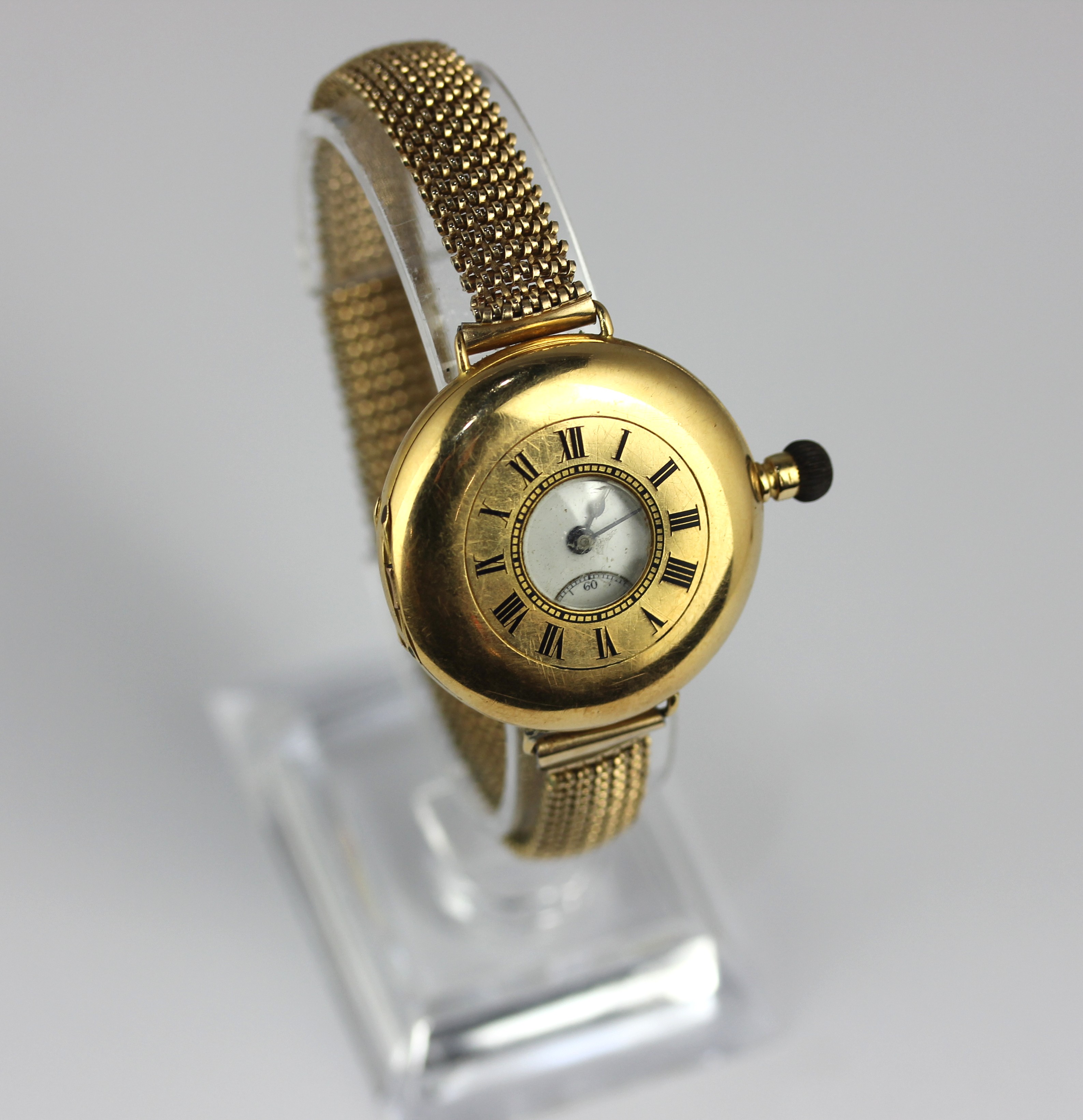 A ladies 18ct gold case half-hunting cased wristwatch, 18ct gold in a case, import mark London 1910 on an expanding metal bracelet