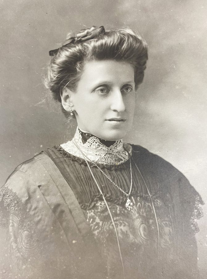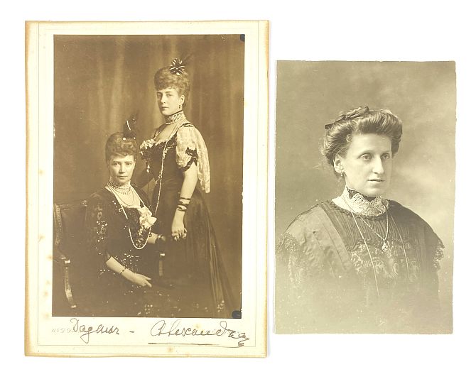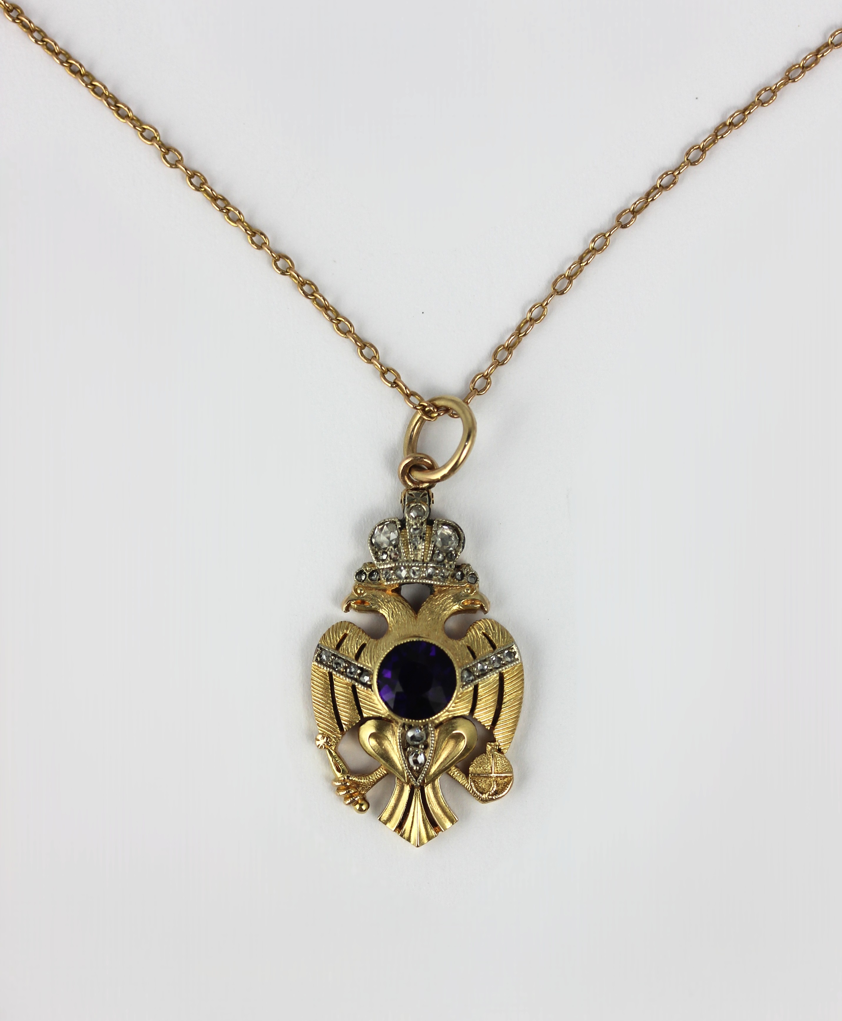 A gold, amethyst and diamond pendant designed as an Imperial Russian twin headed eagle with a crown surmount, by repute the pendant was converted from a Russian stick pin, possibly by Faberge; unmarked, collet set with the circular cut amethyst at the centre and otherwise set with rose cut diamonds, with an associated gold neck chain, combined gross weight 7g; with two portrait photographs including one of a lady wearing the pendant; with accompanying family historical detail