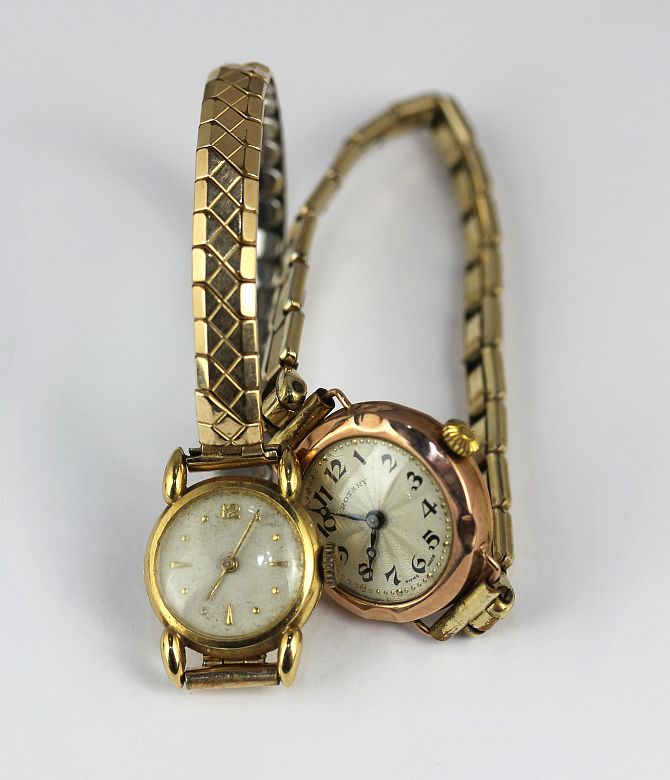 A Rotary 9ct gold circular cased ladies wristwatch Chester 1931, and a smaller gold cased ladies wristwatch, both having expanding metal bracelets