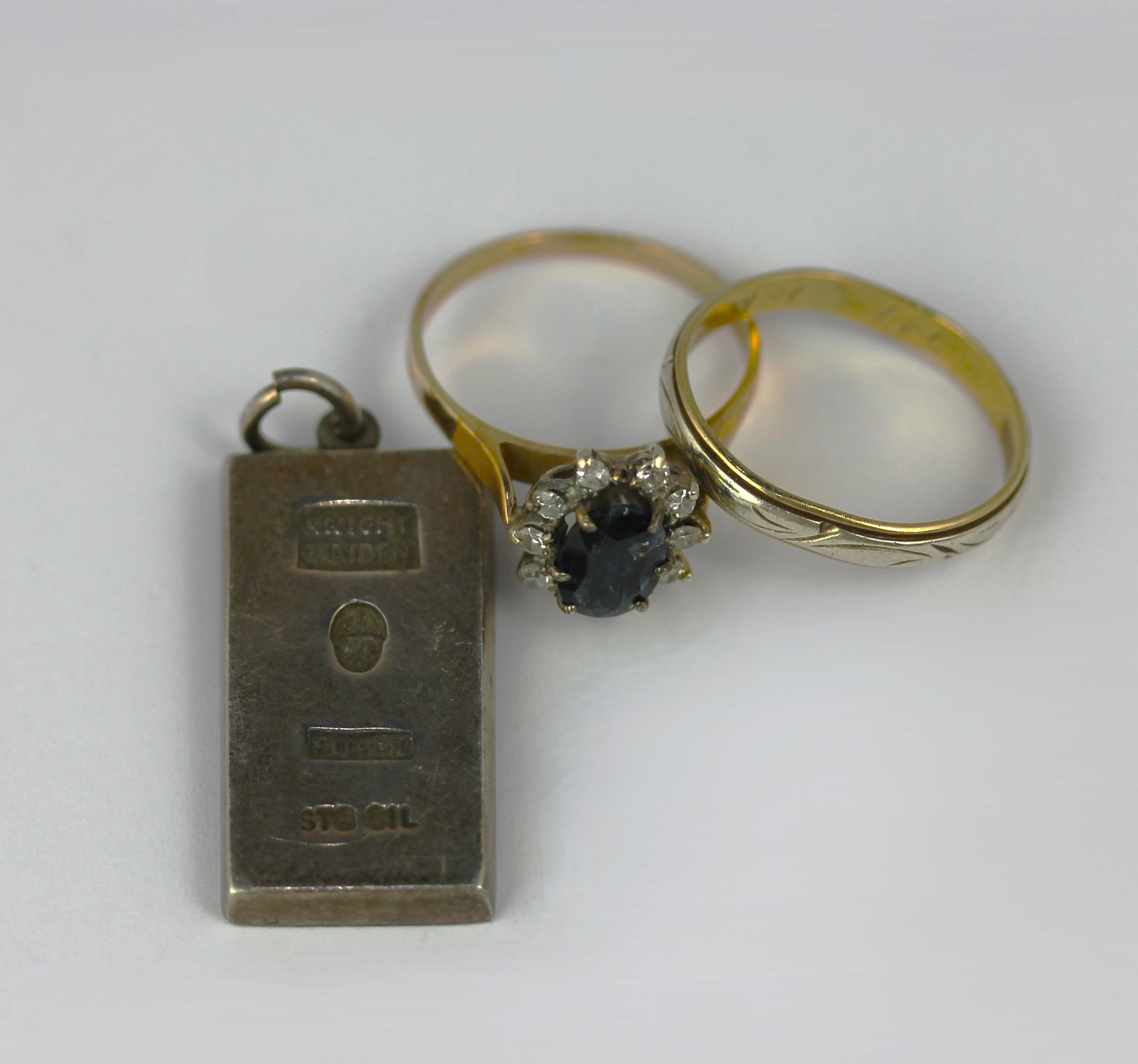 A gold, sapphire and diamond oval cluster ring size I weight 1.9g with a two colour wedding ring and a silver ingot pendant