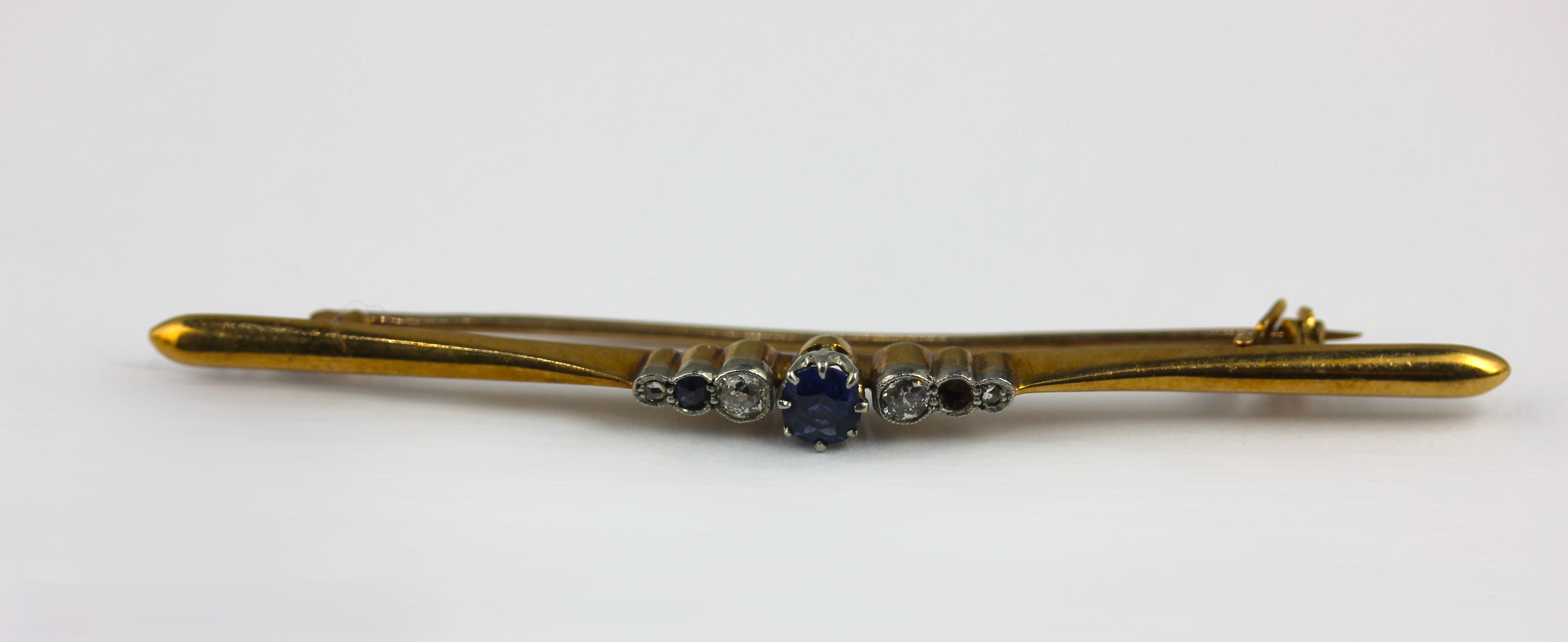 A gold sapphire and diamond bar brooch claw set with the principal cushion shaped sapphire at the centre, one further small sapphire lacking; detailed S.U. 15ct, length 6.7 cms, gross weight 4.4 gsm