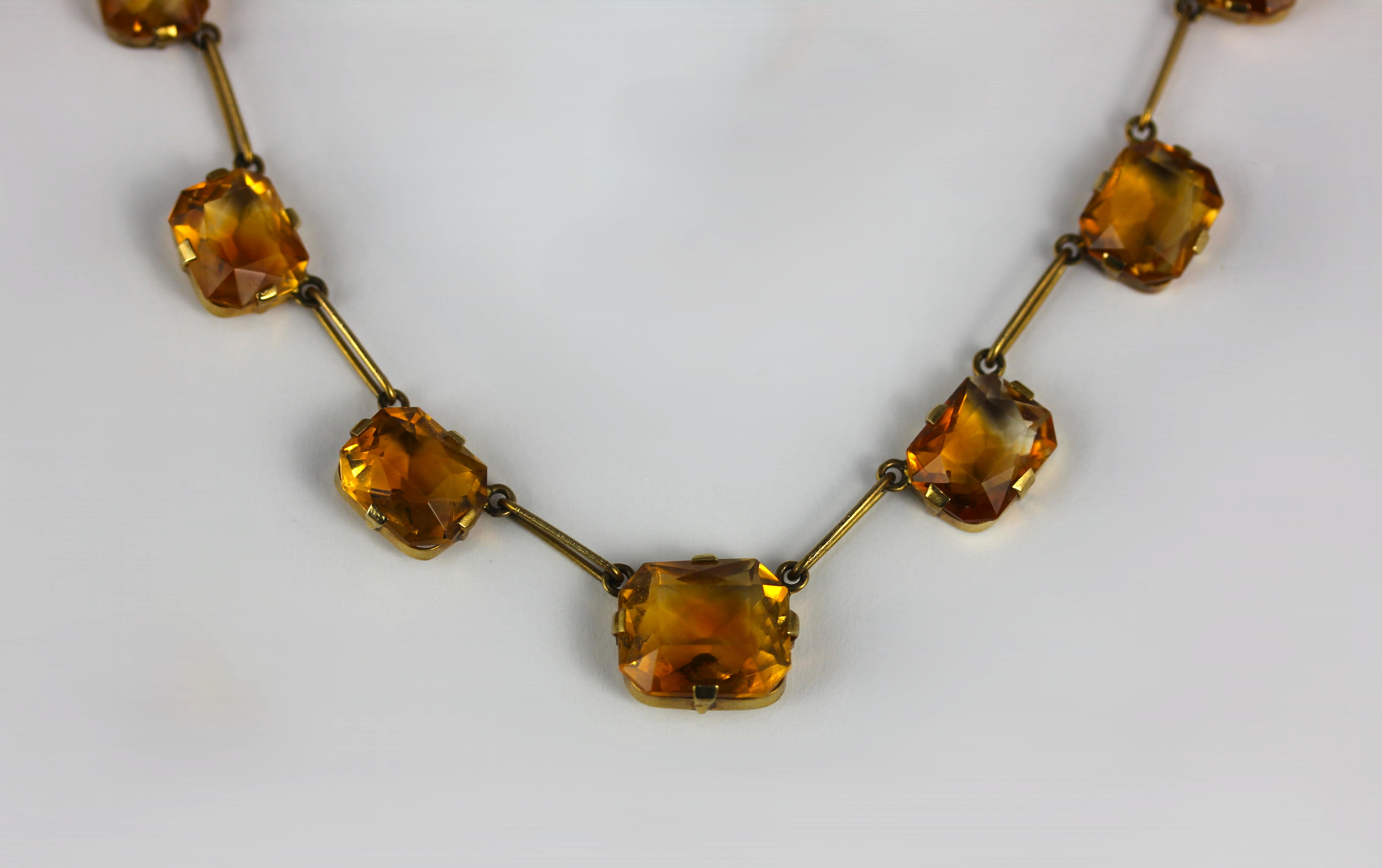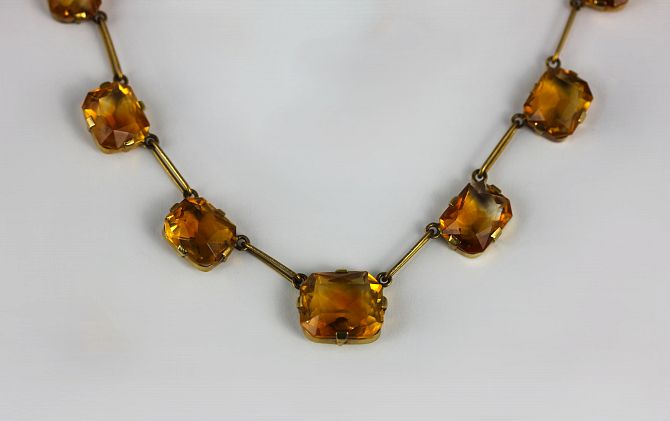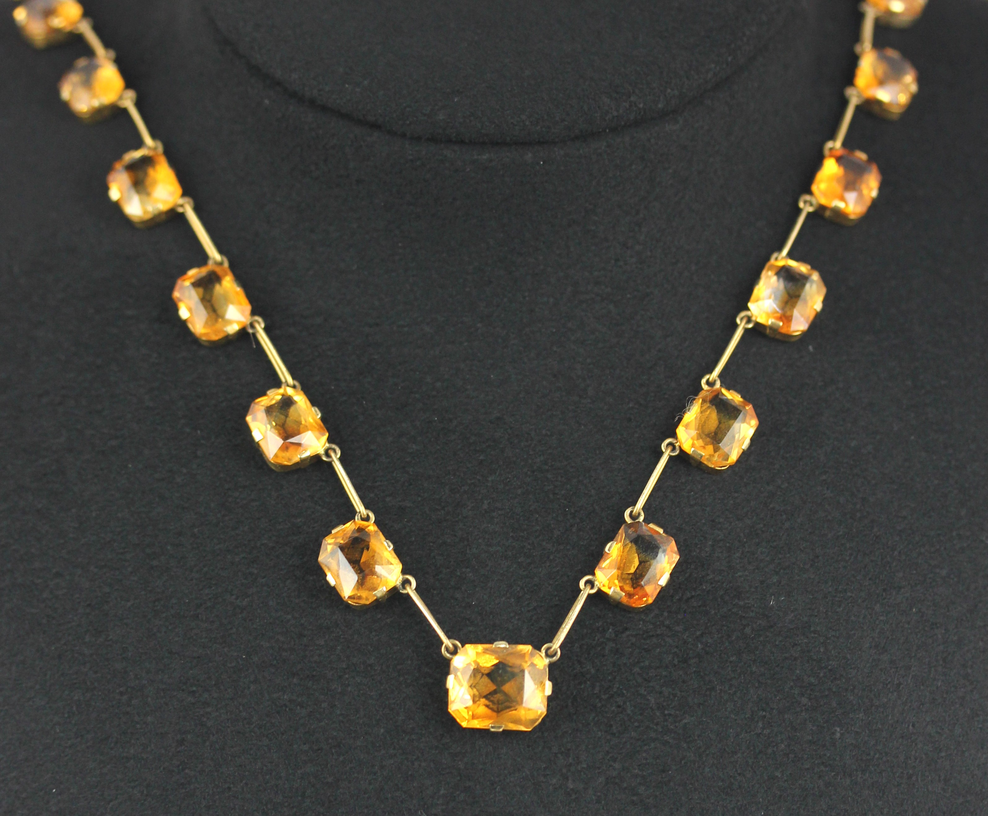 A gold and citrine necklace mounted with a row of graduated cut cornered rectangular citrines on a boltring clasp, the end link detailed 9KT, length 40cm, gross weight 16 gms