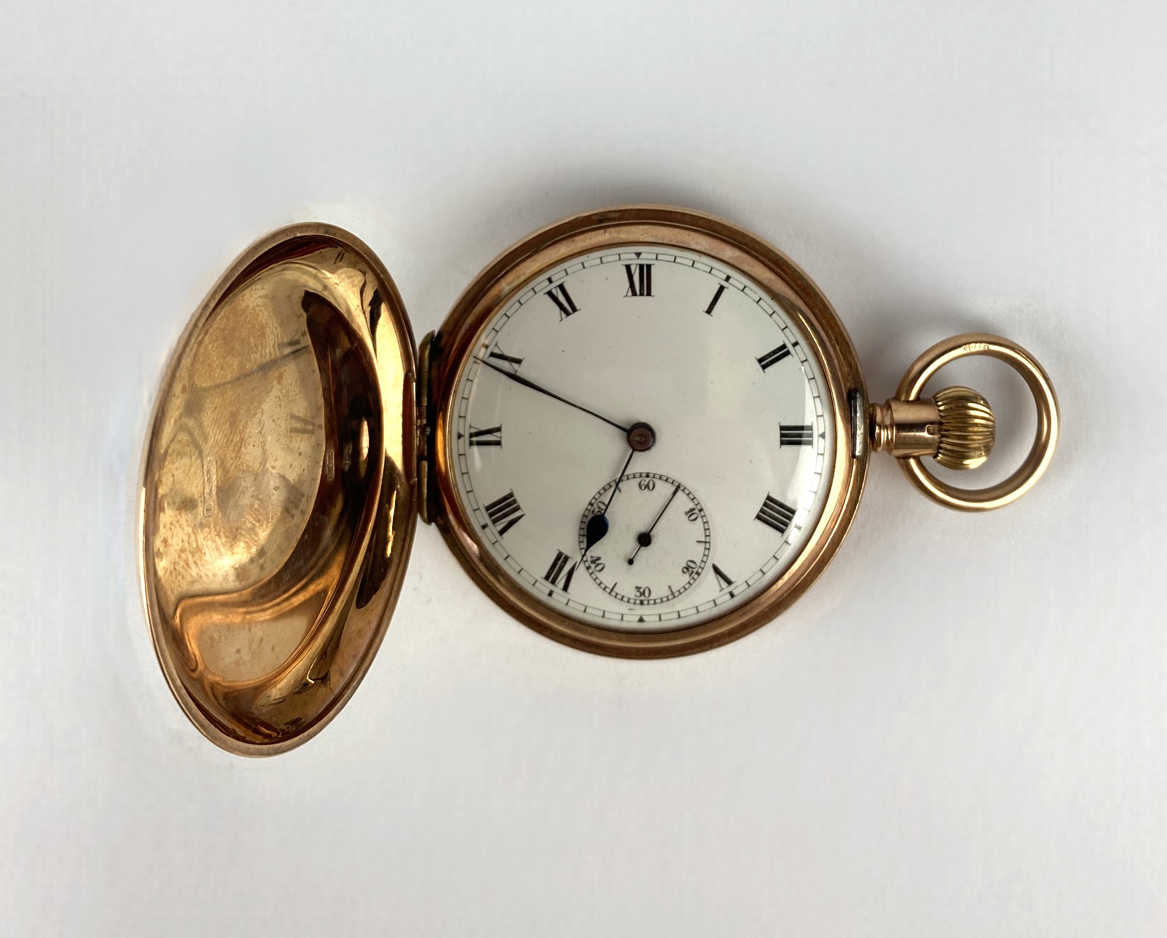 A 9ct gold full hunter pocket watch, with integrated top winder, the white enamel dial with subsidiary seconds dial, the movement stamped 'Safety Pinion' and numbered 621941, London 1919, total combined weight of watch case, movement, workings, etc, 92 gms.