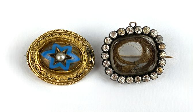 A Victorian gold plated, blue enamel and seed pearl brooch with applied decoration, 3cm wide, (af). together with a Georgian paste mounted mourning brooch containing a lock of hair, 3cm wide, (2).