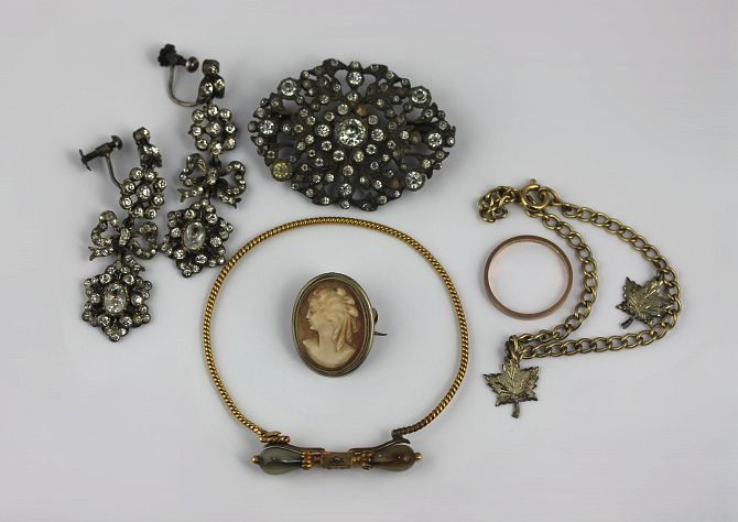 Six items of jewellery comprising a gold wedding ring, unmarked, weight 1.3 gms; a pair of colourless paste pendant earrings with a box; two brooches; an agate bangle; and a bracelet, having two maple leaf charms