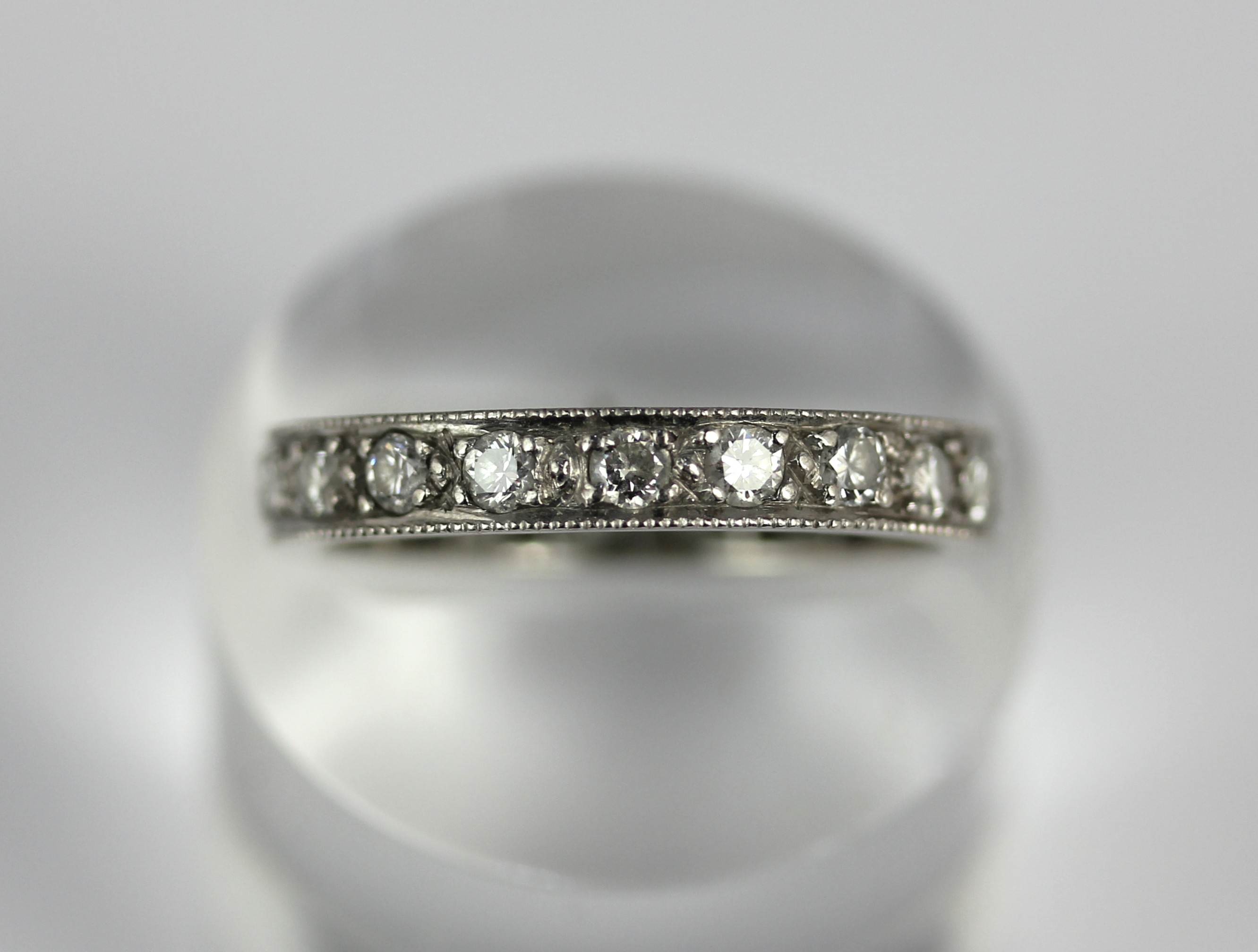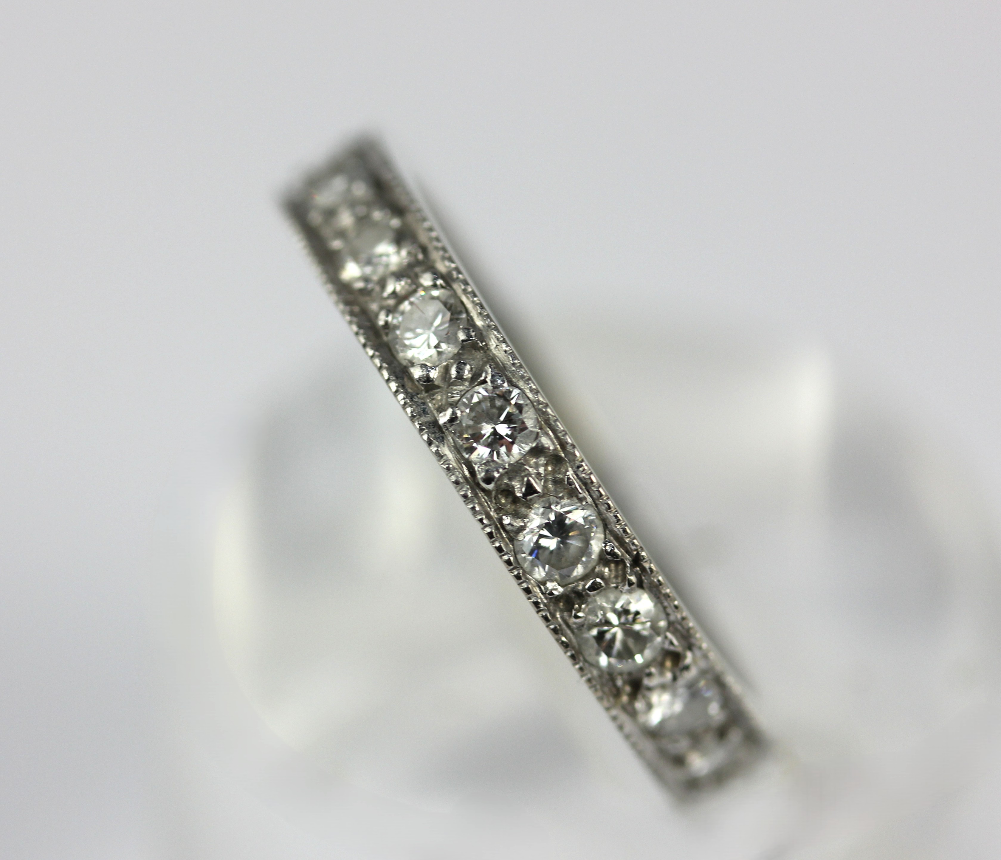 A diamond full eternity ring mounted with circular cut diamonds with plain sides, unmarked, ring size O, gross weight 3.6 gms, with a case