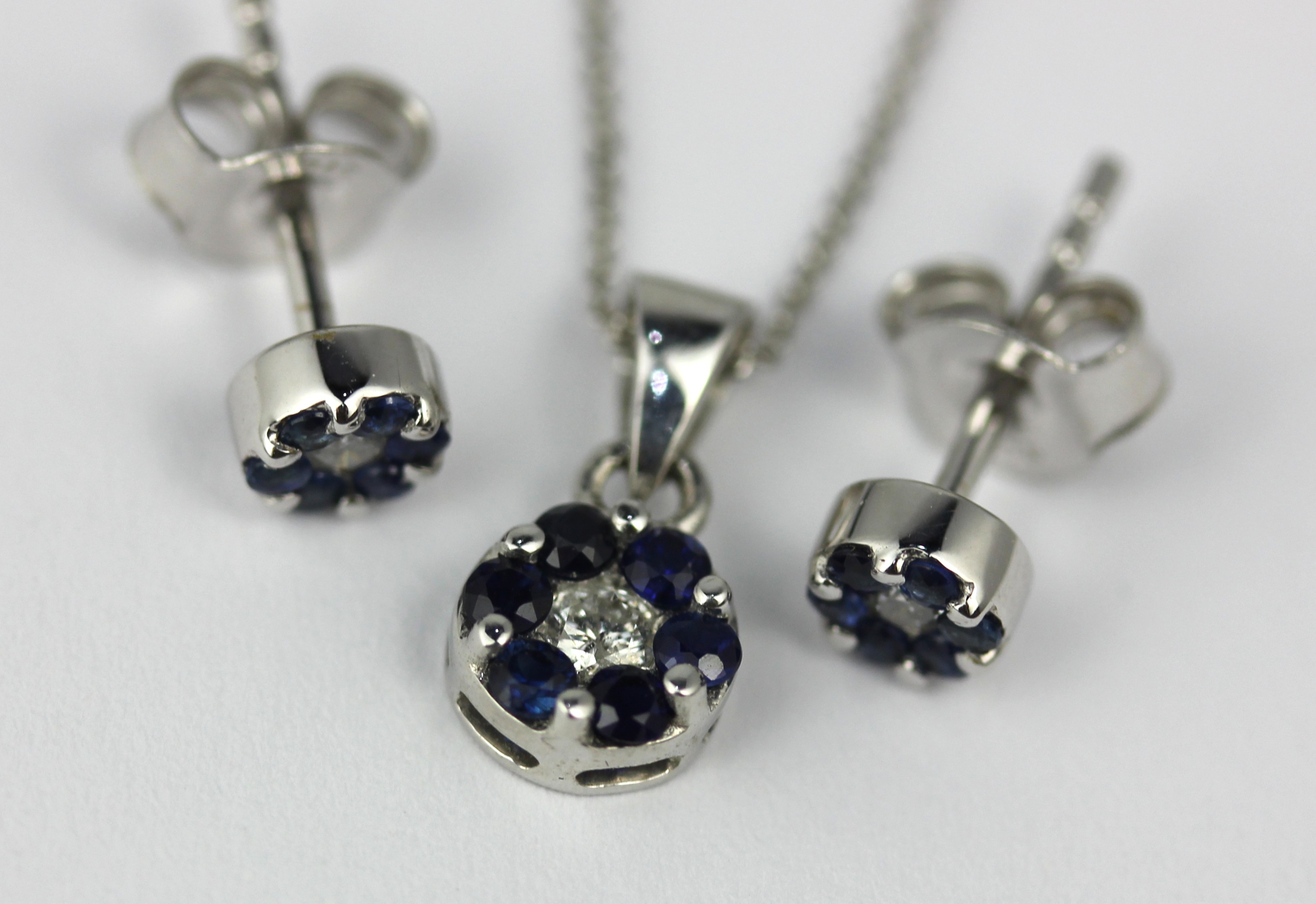 A 9ct white gold, sapphire and diamond seven stone cluster pendent with a white gold neck chain detailed 375 and a pair of 9ct white gold sapphire and diamond, seven stone cluster ear studs, with post and differing butterfly fittings detailed 375 combined weight 2.6g