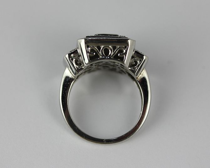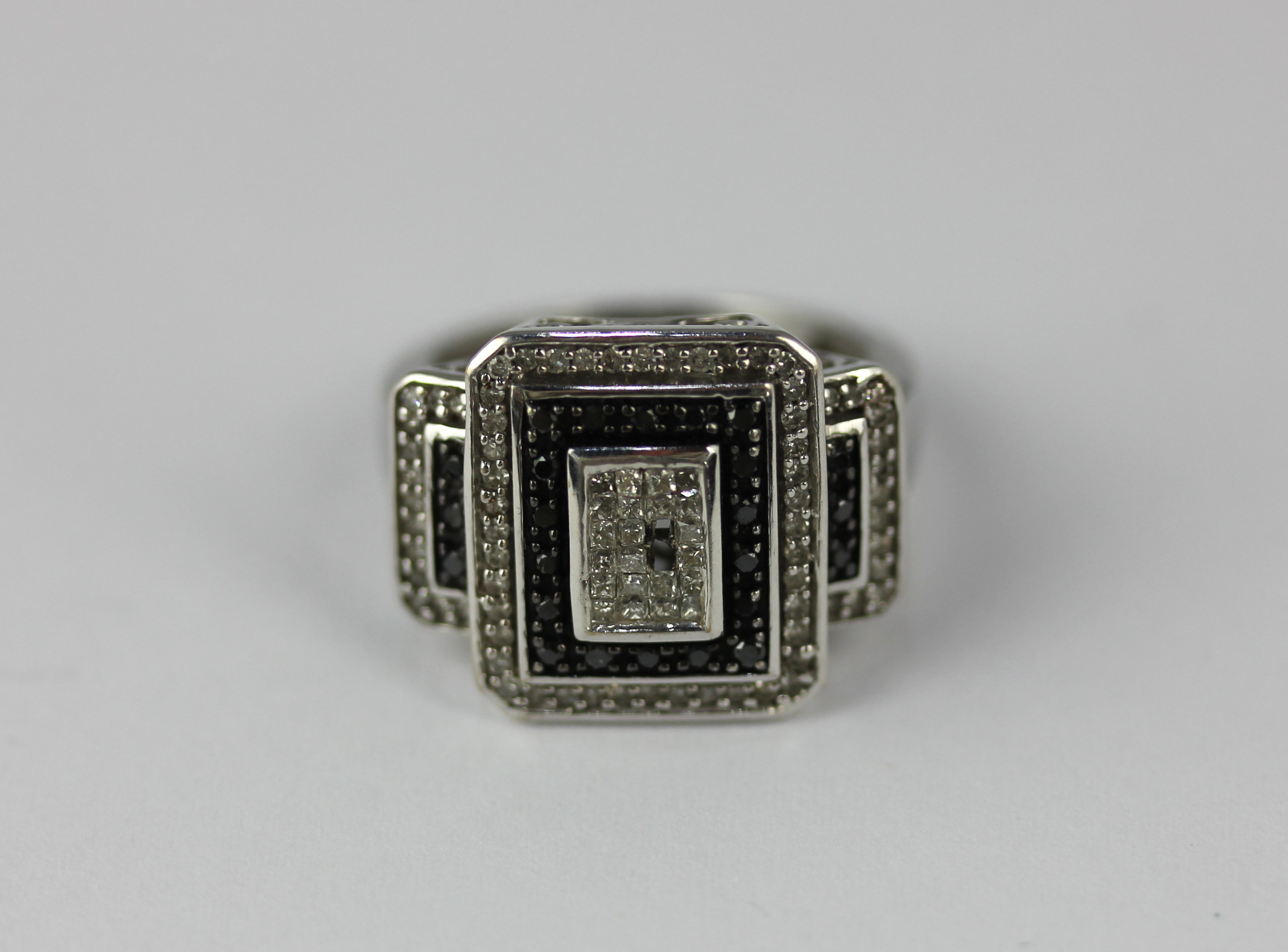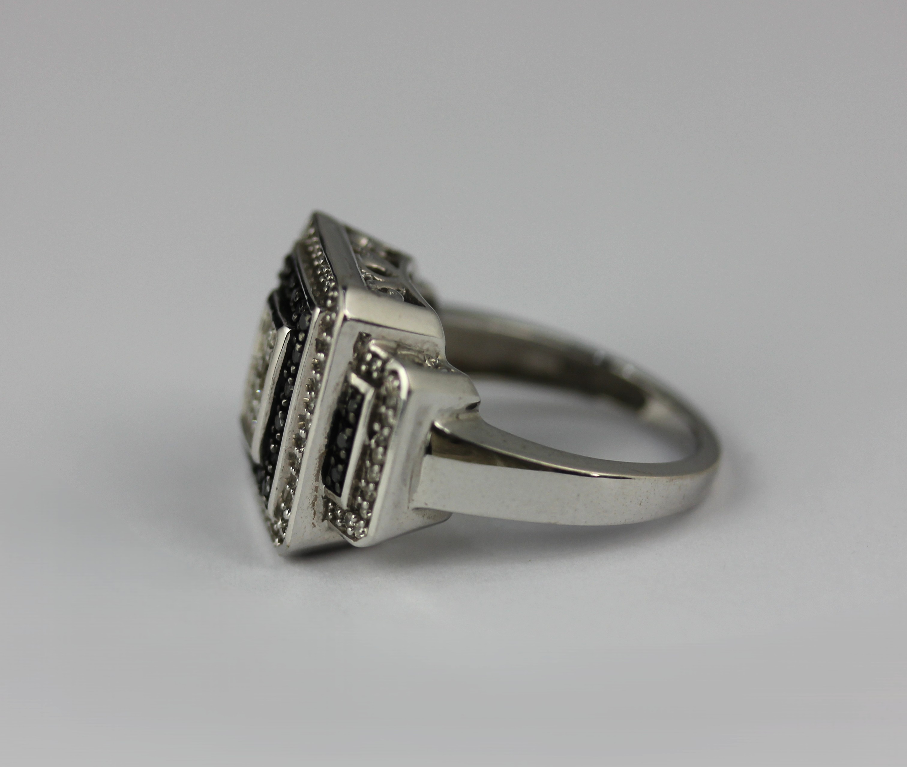 A white gold, diamond and black diamond ring in a rectangular panel shaped geometric design, detailed 10K size N weight 6.7g (two diamonds missing)
