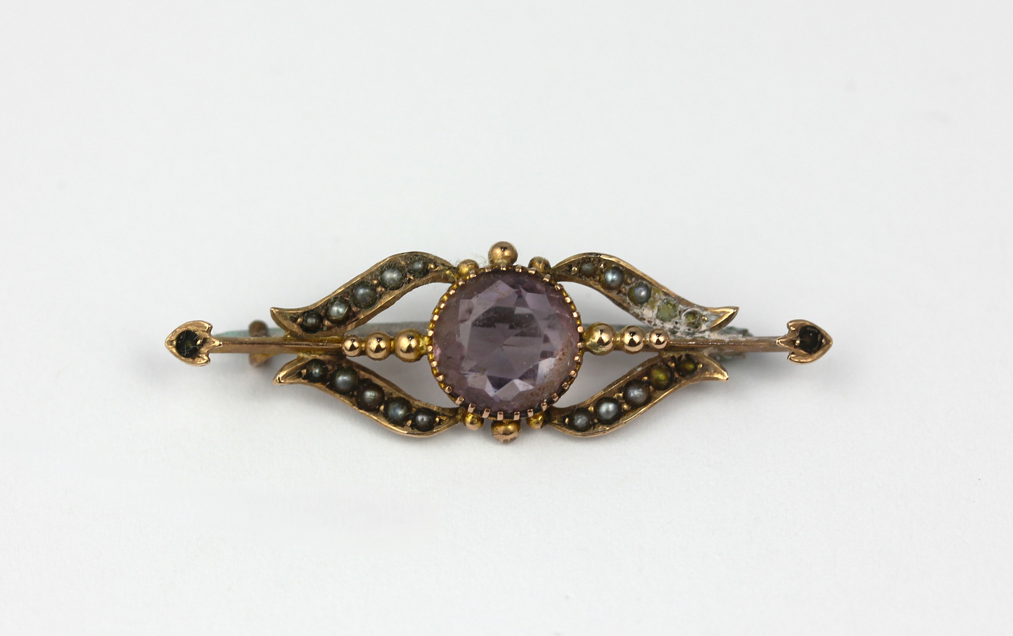 A 9ct gold amethyst and seed pearl bar brooch with a case (a/f)