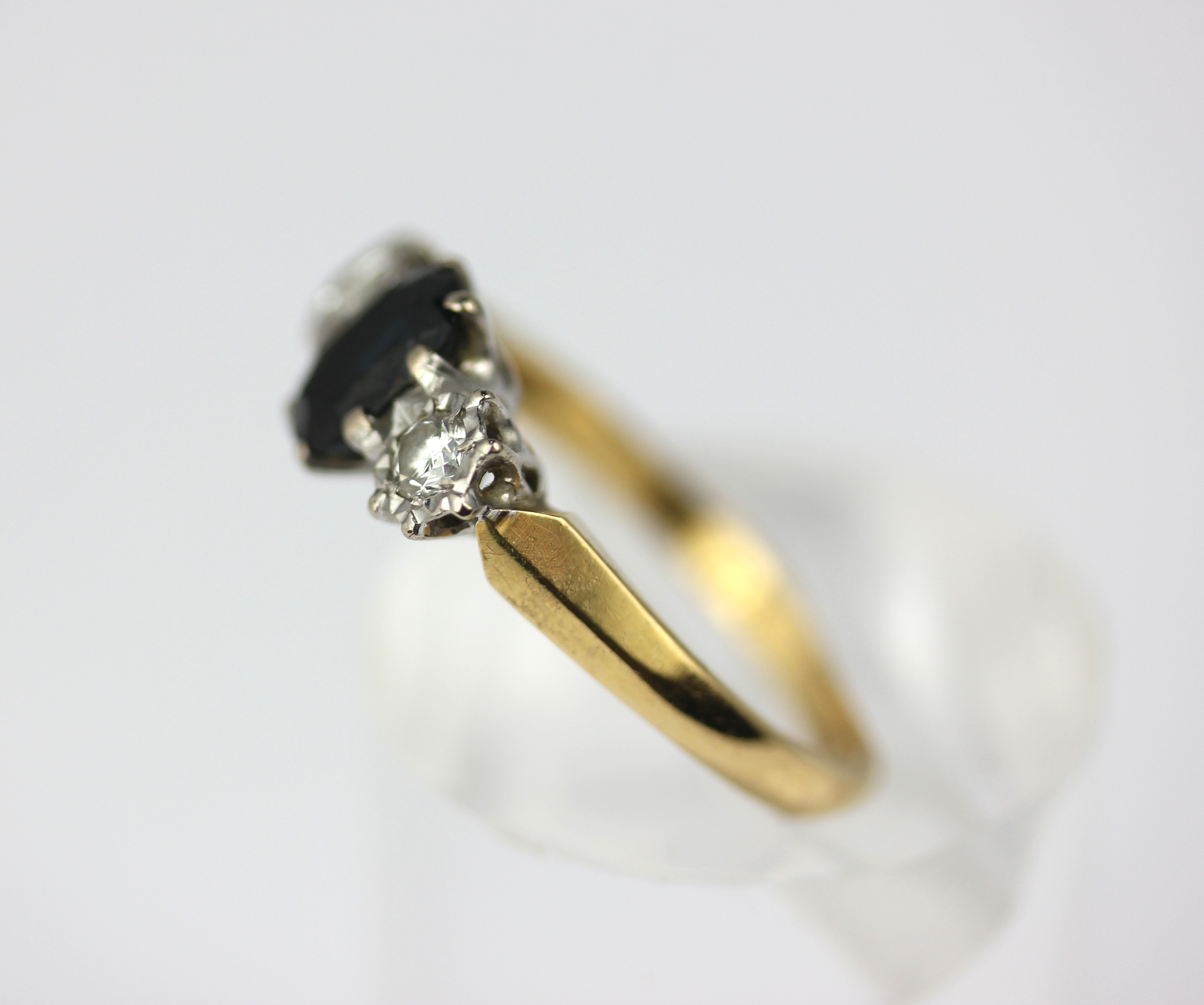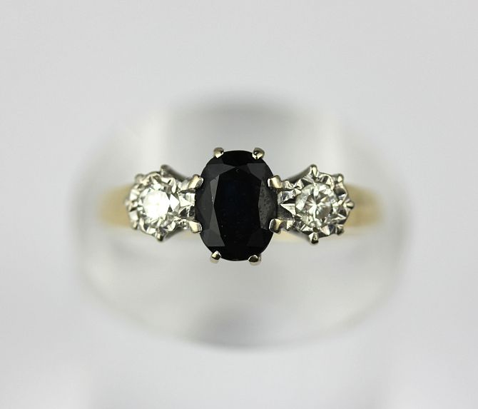 A 18ct gold sapphire and diamond three stone ring claw set with the oval cut sapphire at the centre between two circular cut diamonds ring size P gross weight 4.1g