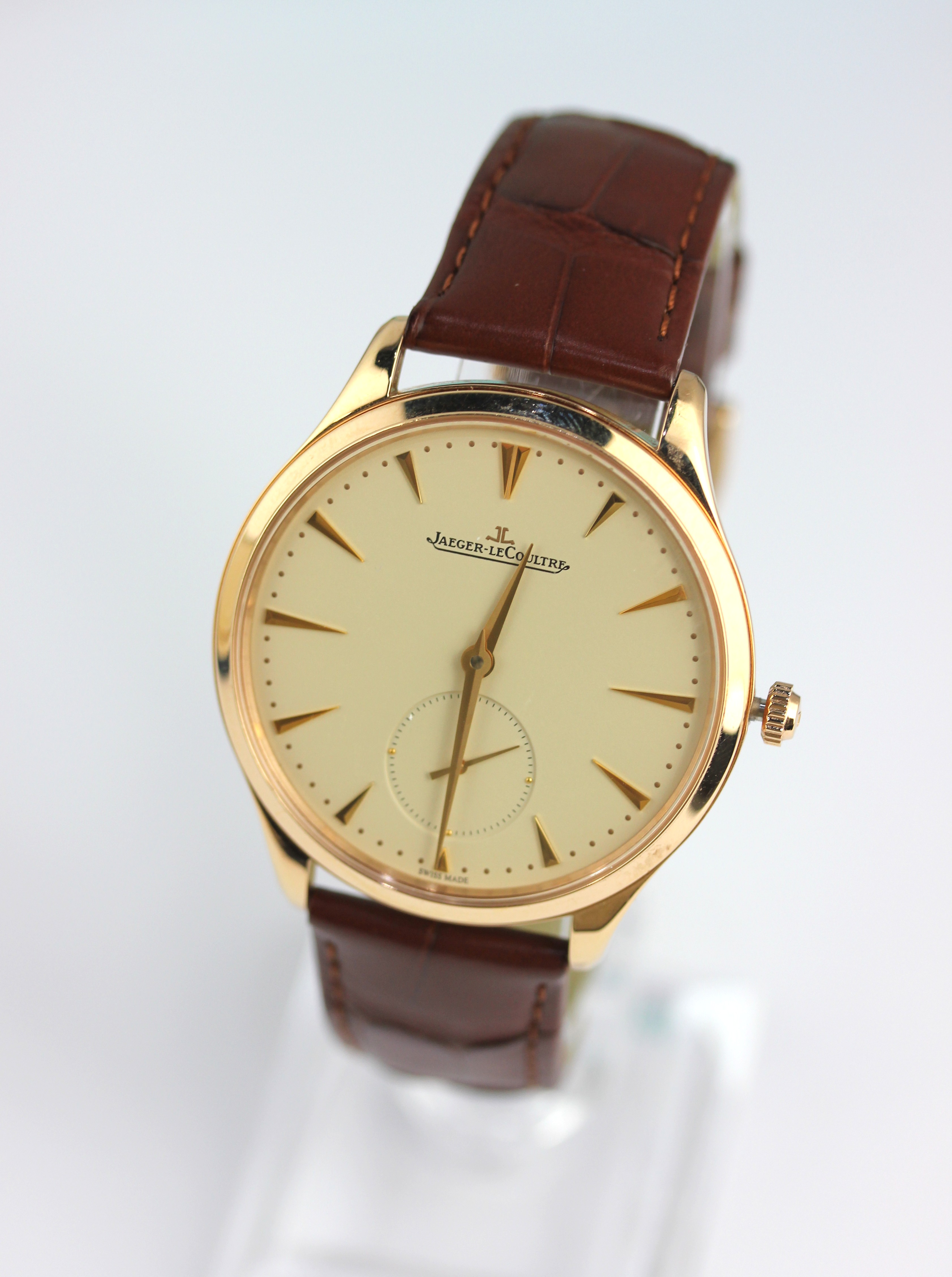 A Jaeger-Le Coultre 18ct gold cased Master Control 1000 hours gentlemans automatic wristwatch, the movement visible from the case back, fitted to a Longines brown alligator leather strap having an 18ct gold buckle, with a Jaeger-Le Coultre bag