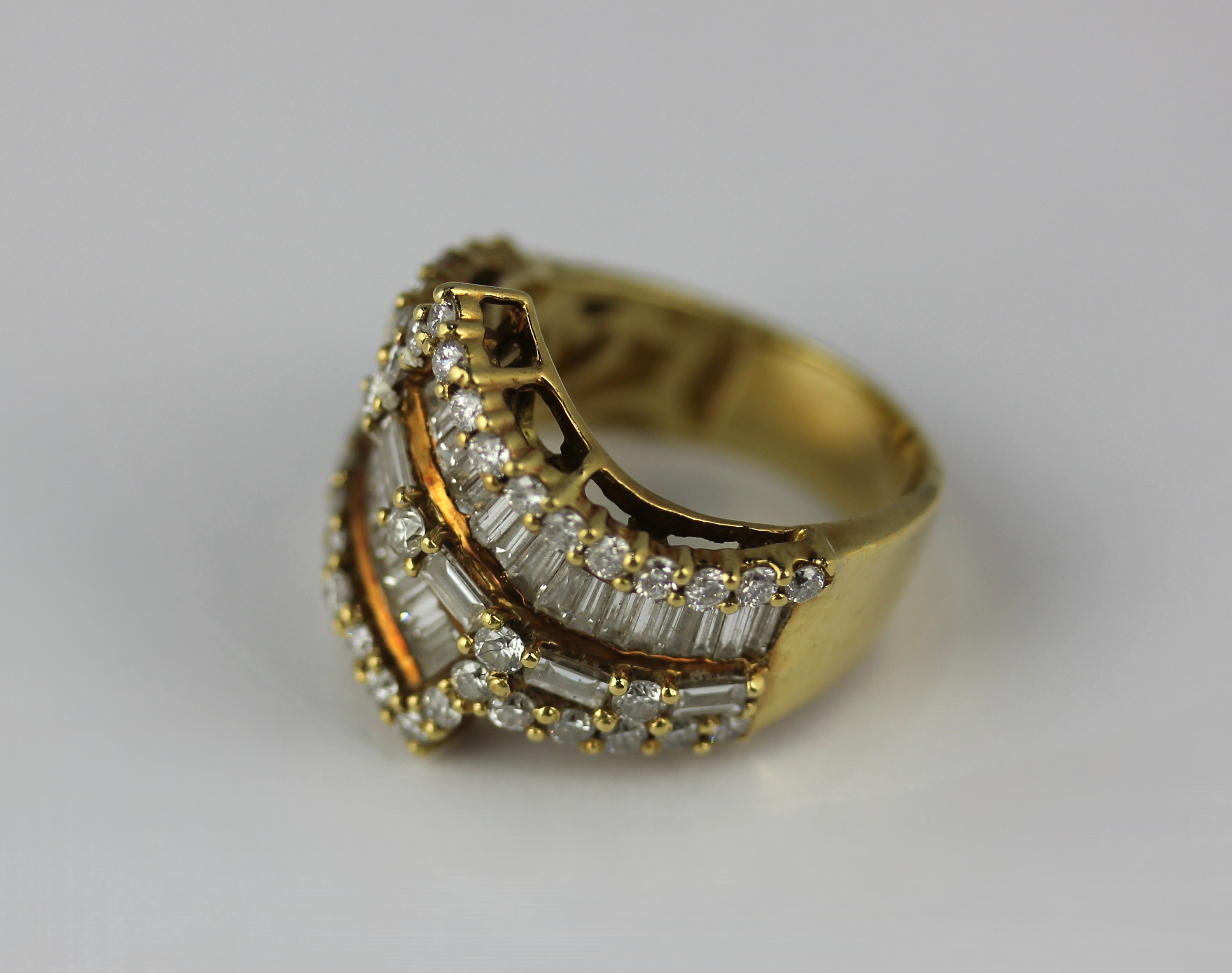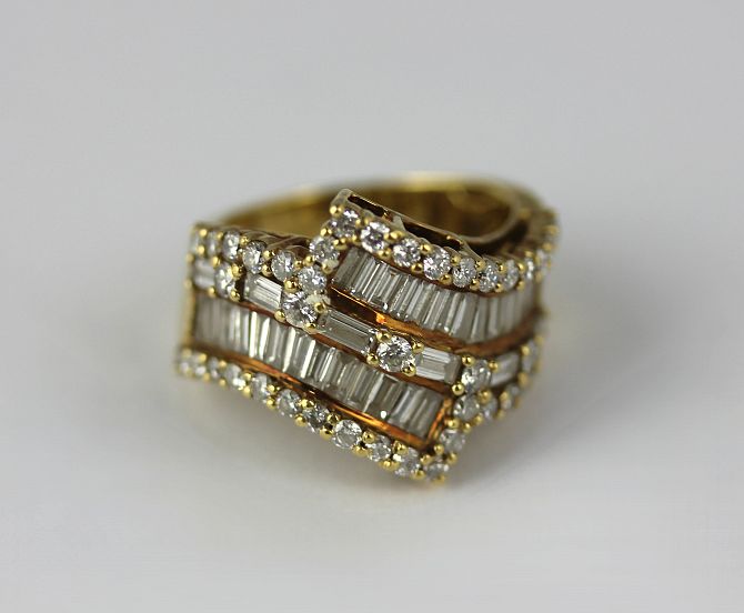 A gold and diamond ring in A twist design mounted with baguette and circular cut diamonds detailed 750 size L and 1/2 weight 10.7g