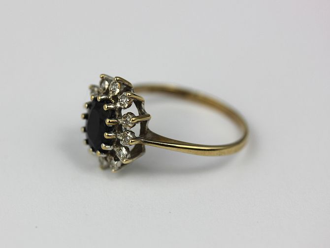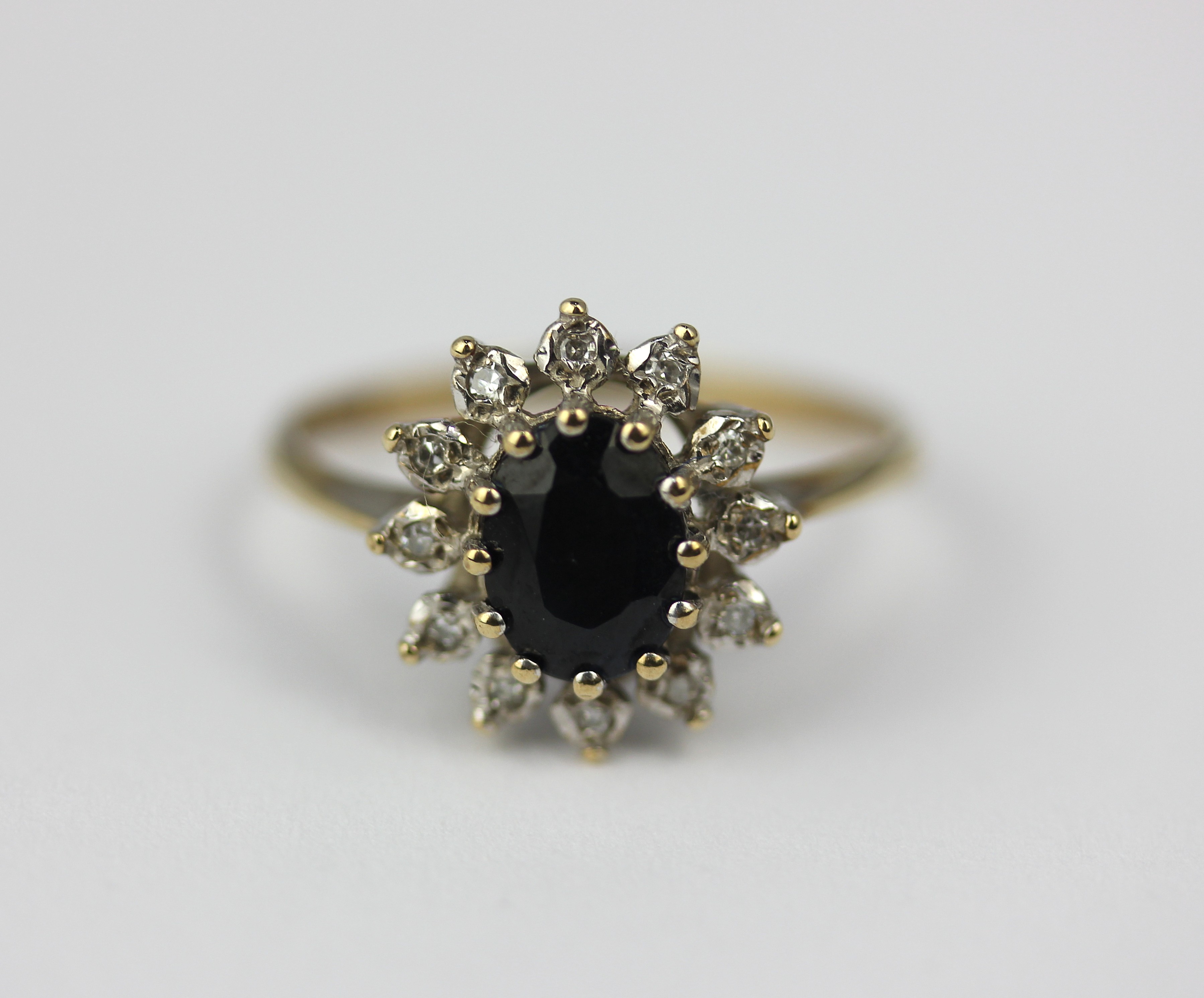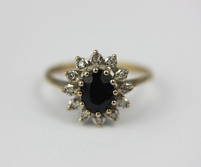 A 9ct gold, sapphire and diamond oval cluster ring claw set with the oval set sapphire in a surround of circular cut diamonds ring size Q gross weight 2.4g