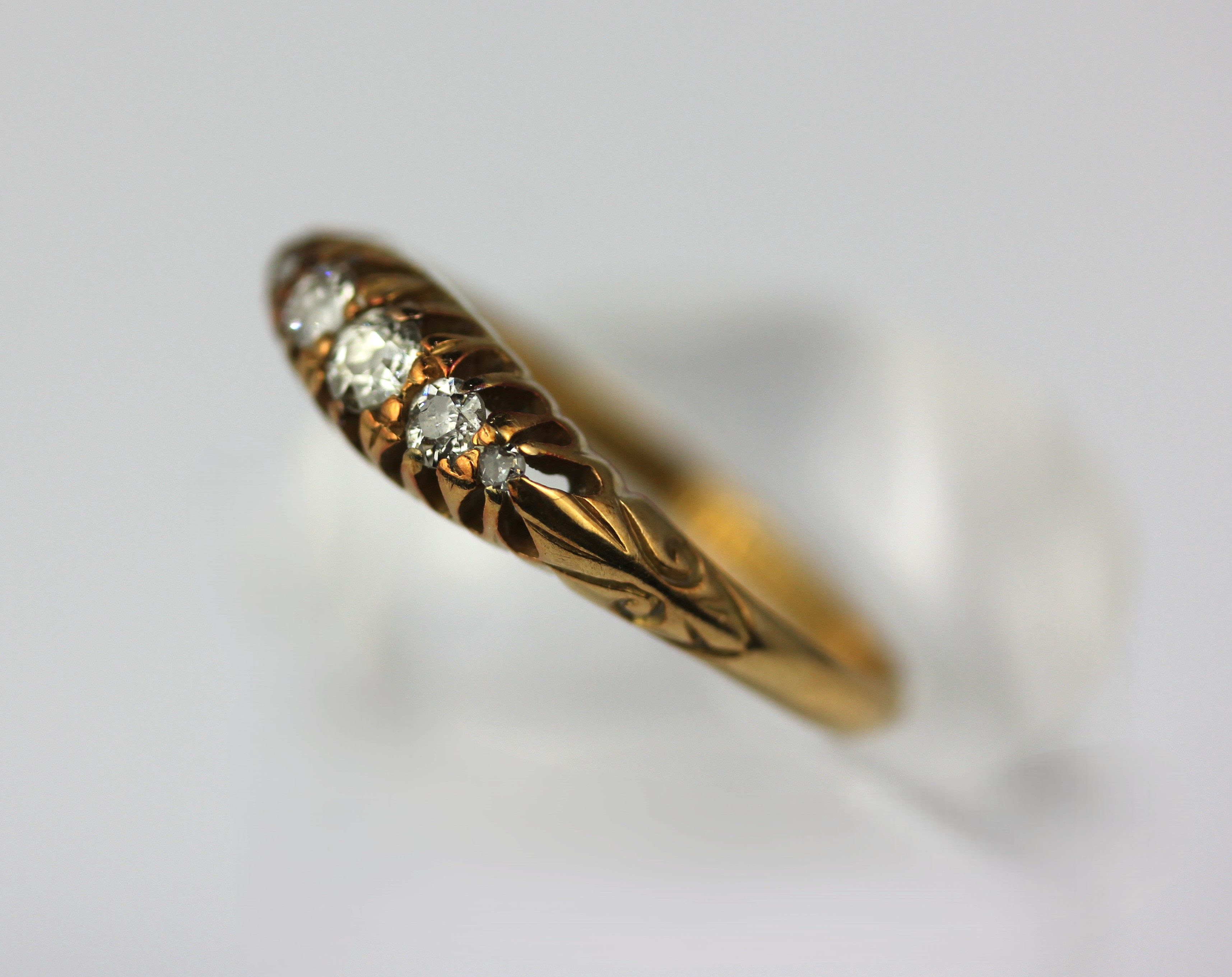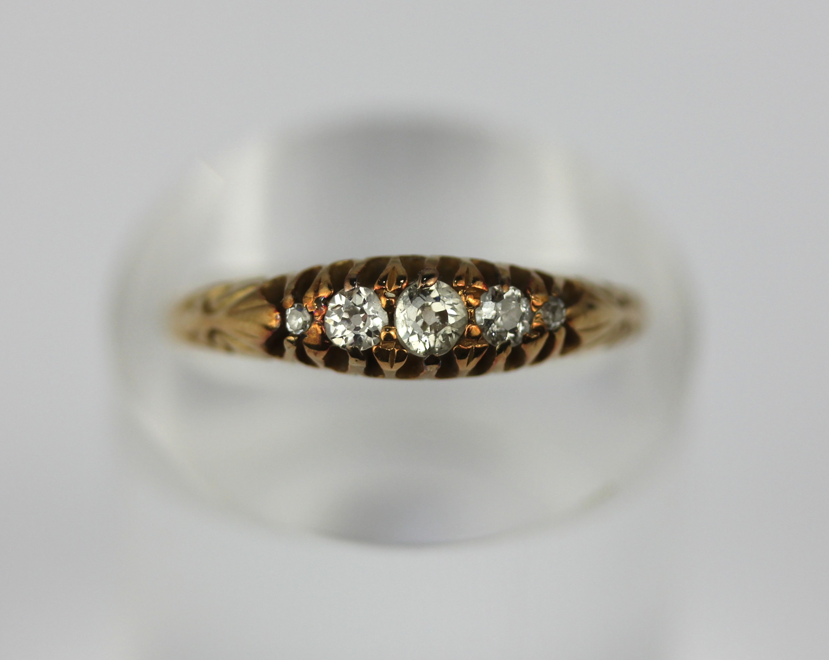 An 18ct gold and diamond five stone ring mounted with graduated cushion shaped diamonds, Birmingham 1916, ring size Q gross weight 2.8g