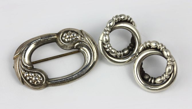 A Georg Jensen silver brooch and a pair of ear studs the brooch of shaped oval open work form, detailed Georg Jensen 77 sterling Denmark, and the ear studs unmmarked; combined weight 11 gms