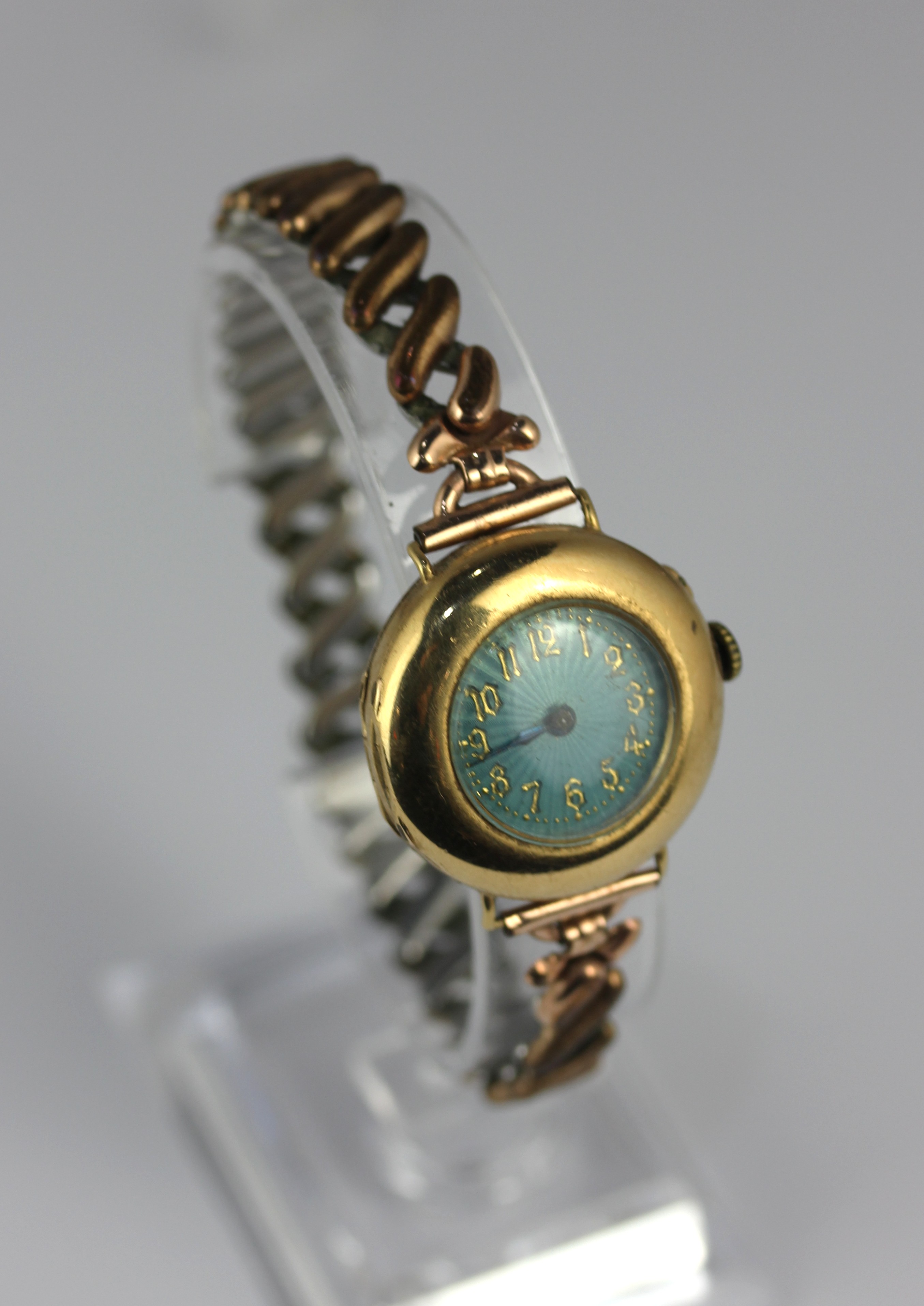 A ladies gold cased wristwatch with an unsigned movement, the inner and outer case detailed K.18, with an unsigned blue enamel dial, on an expanding metal bracelet