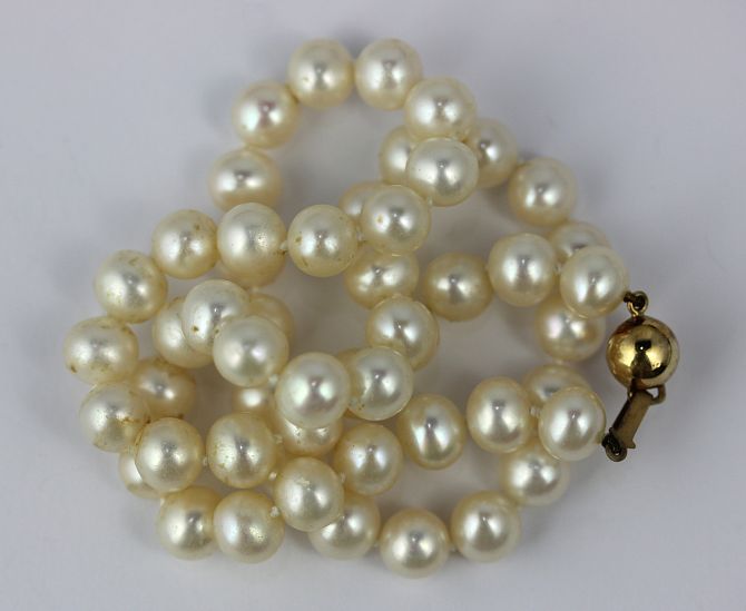 A single row necklace of cultured pearls on a gold spherical clasp detailed indistinctly 9ct