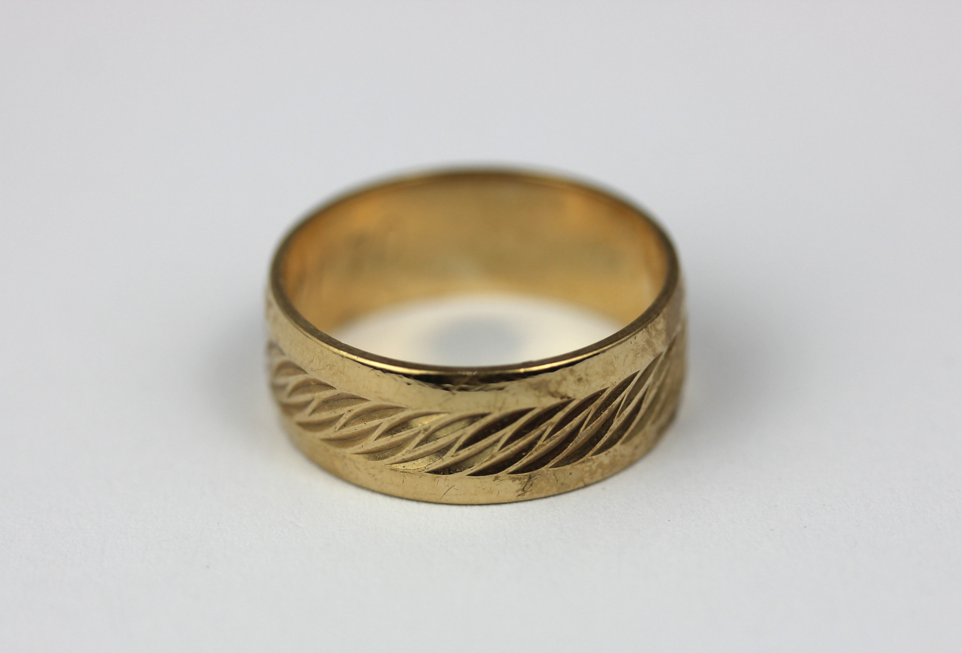 A 9ct gold wide band wedding ring, with engraved slanting decoration, London 1979, size M 1/2, 3.8g