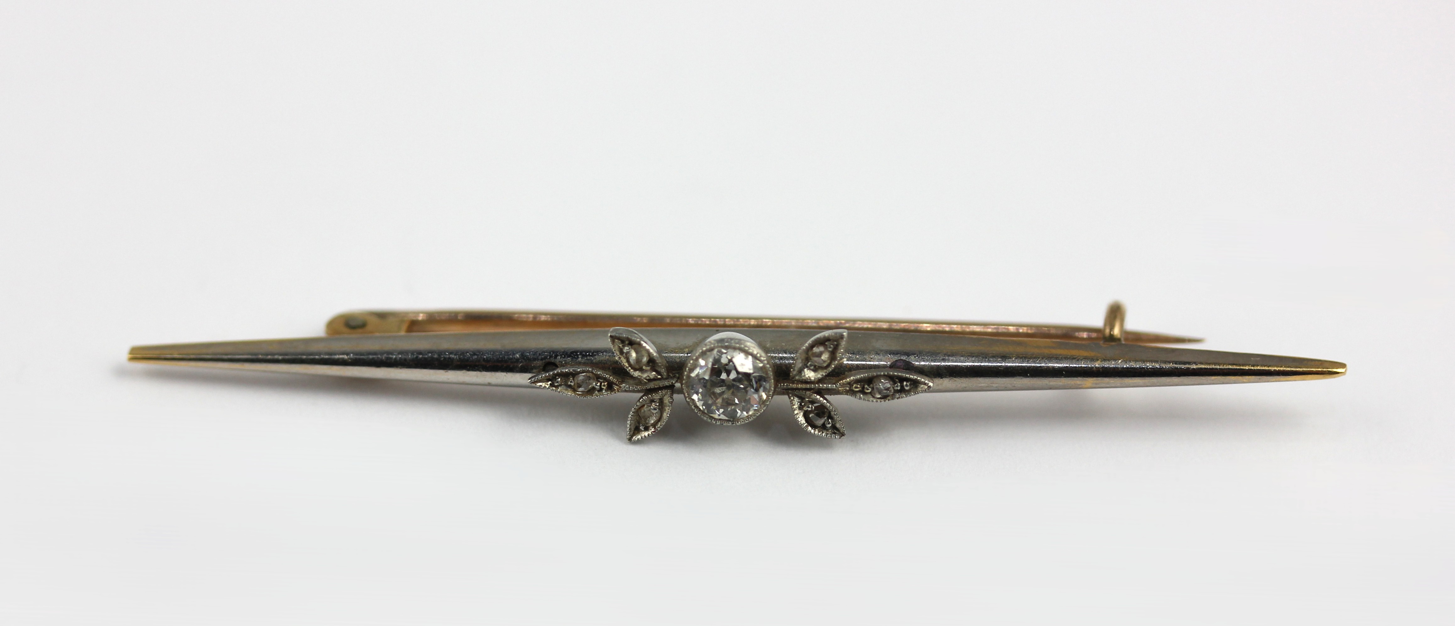 A diamond brooch collet set with the principal old cut cushion shaped diamond at the centre between rose diamond set foliate sides, unmarked, length 5.2 cm, gross weight 4.6 gms