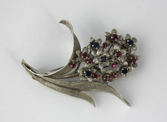 A white gold Ruby and sapphire brooch designed as a floral and foliate spray, detailed K. Mikimoto Tokyo WGK 14 gross weight 13g with a case