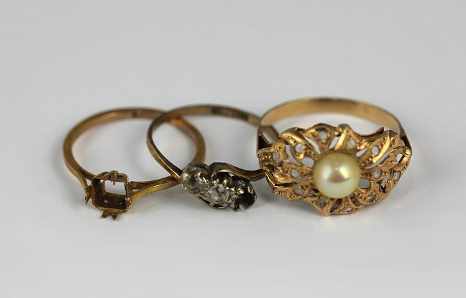 Three gold rings comprising a foreign ring mounted with an imitation pearl, size R, gross weight 2.3 gms, and two further rings both marked 9ct gold, gross weight 2.6 gms