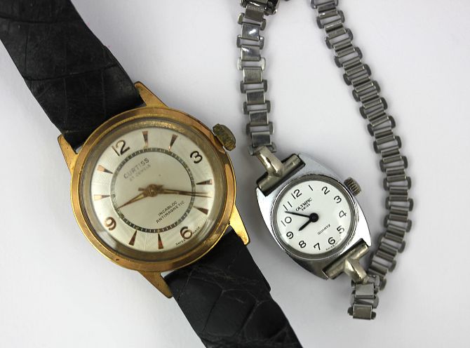 A Curtiss gilt metal fronted and steel backed gentlemans wristwatch and an Olympic quartz ladies wristwatch