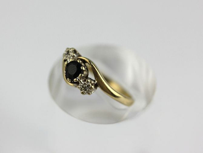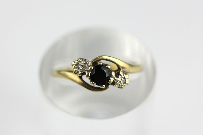 A 9ct gold, sapphire and diamond three stone ring, set with a circular cut sapphire between two smaller circular cut diamonds, size M, gross weight 2.2g, with a case