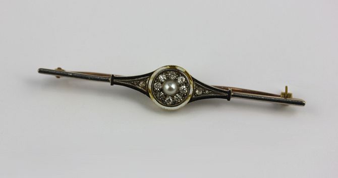 A gold diamond and pearl bar brooch mounted with a single pearl within a surround of 8 cushion shaped diamonds and with a white enamel border, further set with rose cut diamond two stone shoulders, indistinct mark, length 6.2 cm, gross weight 5.3 gms