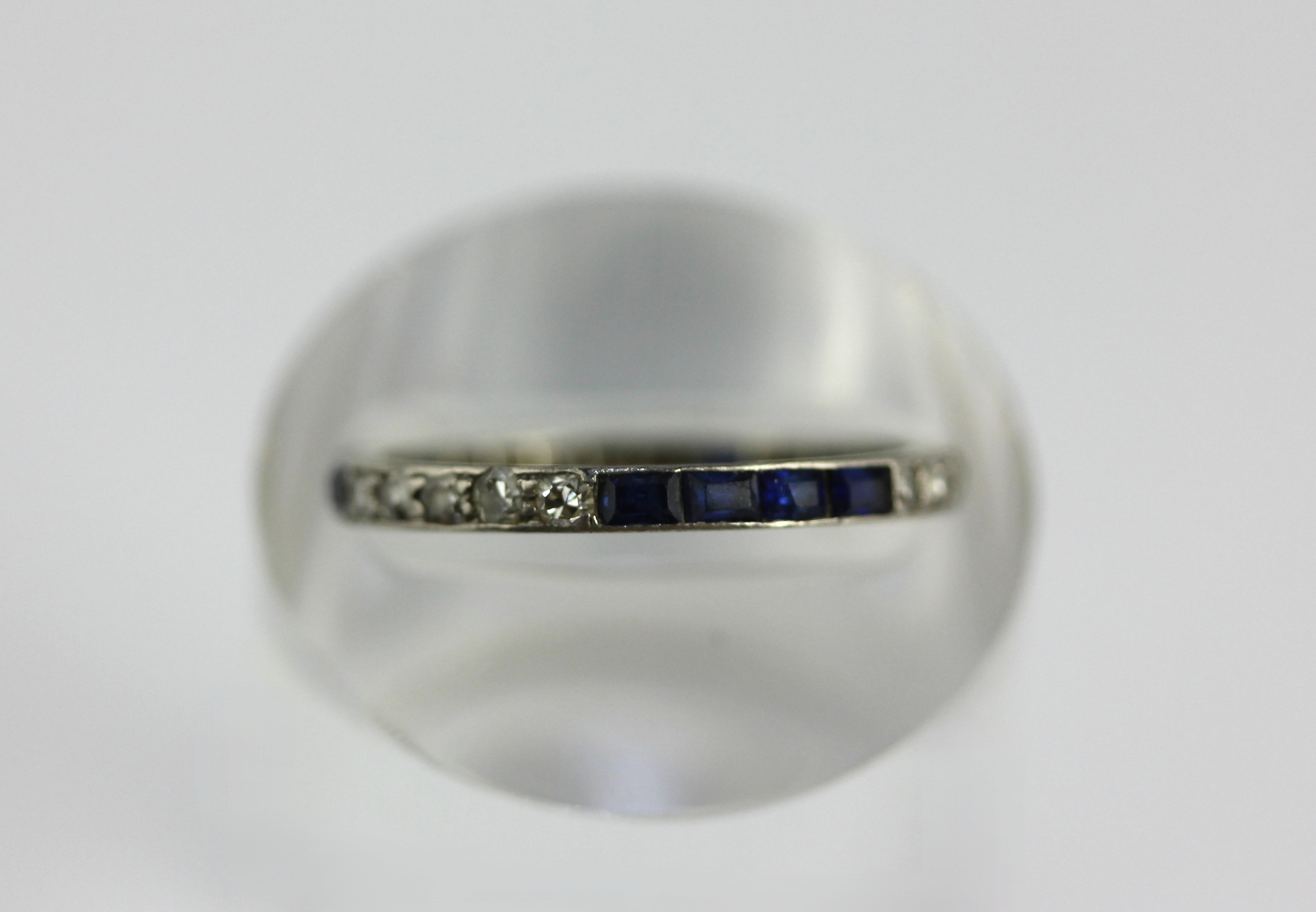 A sapphire and diamond full eternity ring, set with three rows of five single cut diamonds alternating with three rows of rectangular cut sapphires (one sapphire missing), size L, gross weight 1.4g, with a case