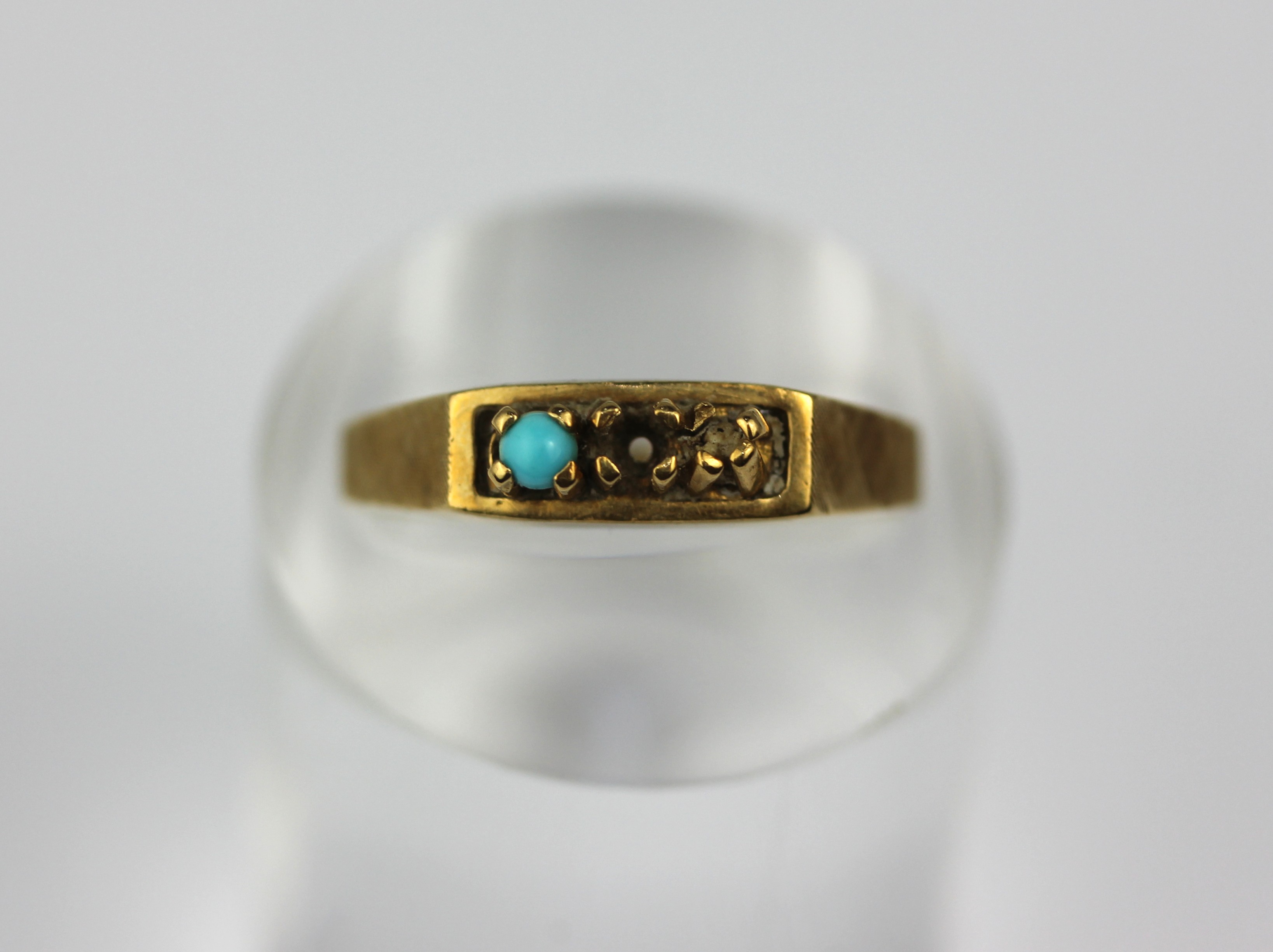 A gold ring set with one turquoise [two further gems lacking] detailed indistinctly 0.750, ring size P gross weight 3g
