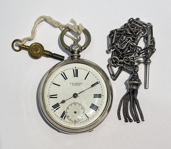 A silver cased key wind open faced pocket watch with a jewelled cylinder movement, the enamelled dial detailed J. W. Benson, London, London 1882, with a key, also a watch chain with a tassel pendant