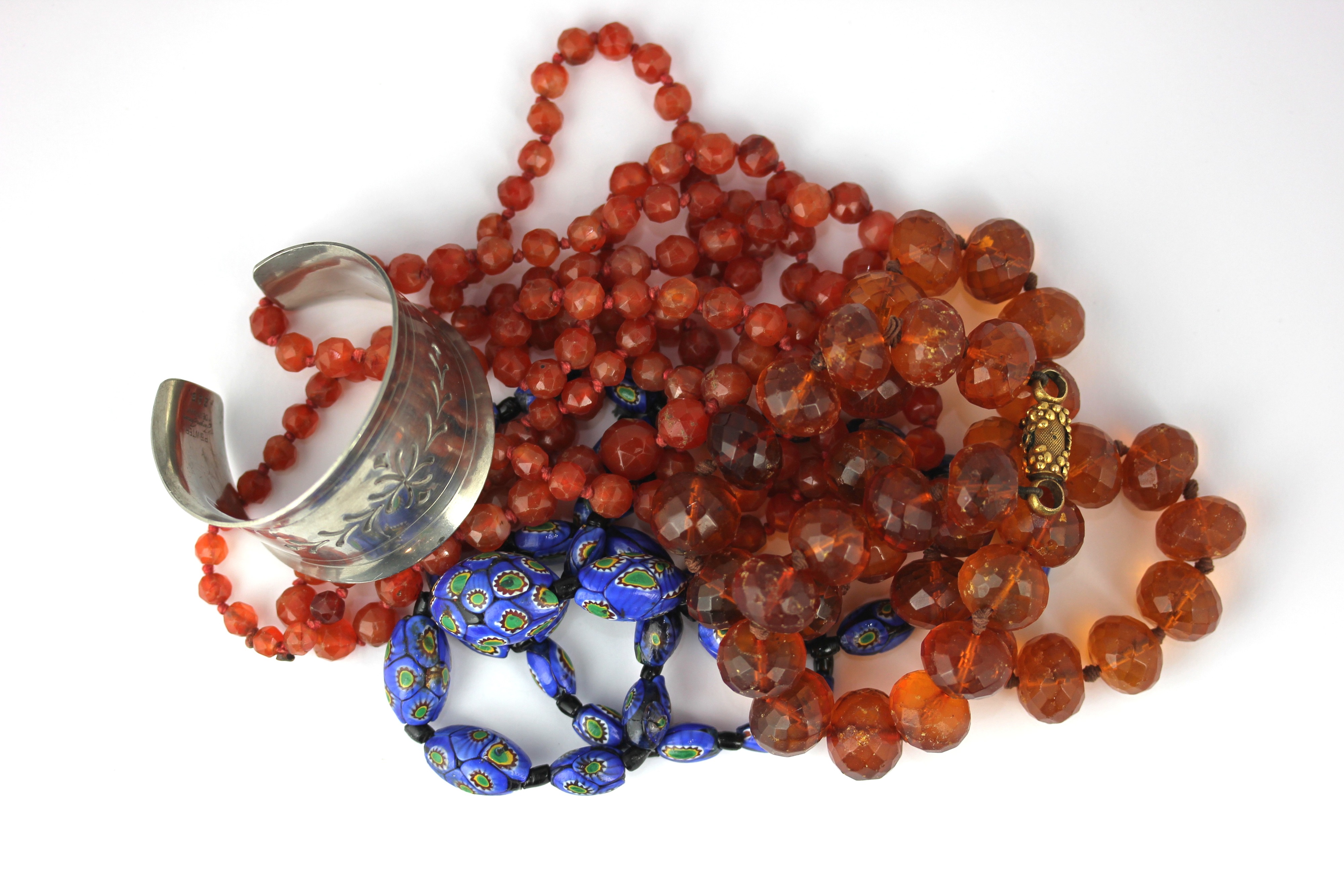 A translucent reconstituted faceted amber bead necklace on a gold clasp, a faceted cornelian bead necklace, a graduated blue millefiori glass bead necklace and a Jorgen Jensen Denmark pewter bangle numbered 225