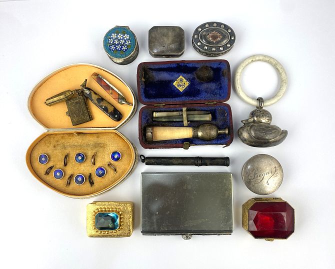 A silver cut cornered rectangular pill box Birmingham 1911, an oval pill box detailed 800, four further boxes, a baby's rattle formed as a duck, and eight further items