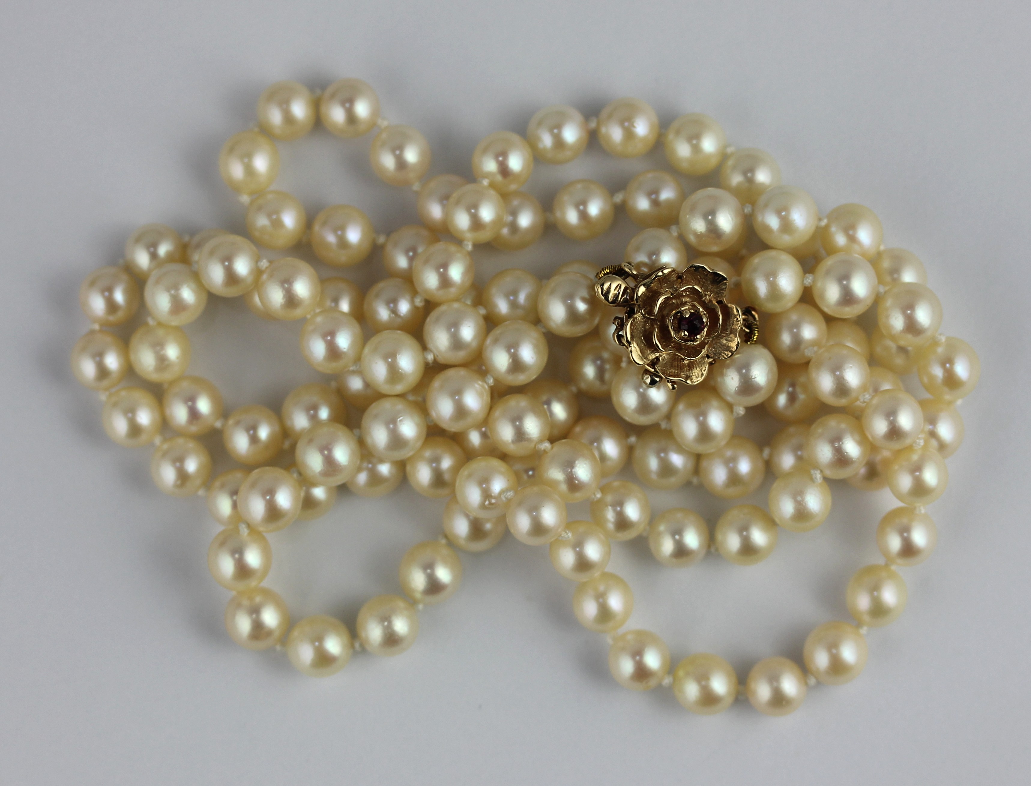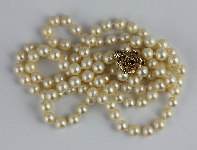 A single row necklace of cultured pearls on a gold and garnet flowerhead clasp 85cm long