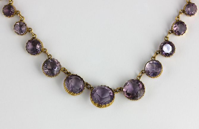 A gold and amethyst neckchain collet set with a row of fifteen graduated circular cut amethysts, on a bolt ring clasp, (one stone repaired), gross weight 13.8g, with a case