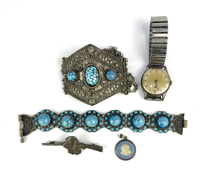 A group of jewellery comprising a silver brooch designed as a dog's head and a gun Birmingham 1950, a silver mounted Wedgwood pendant, two imitation turquoise bracelets, and an oris gentleman's wristwatch
