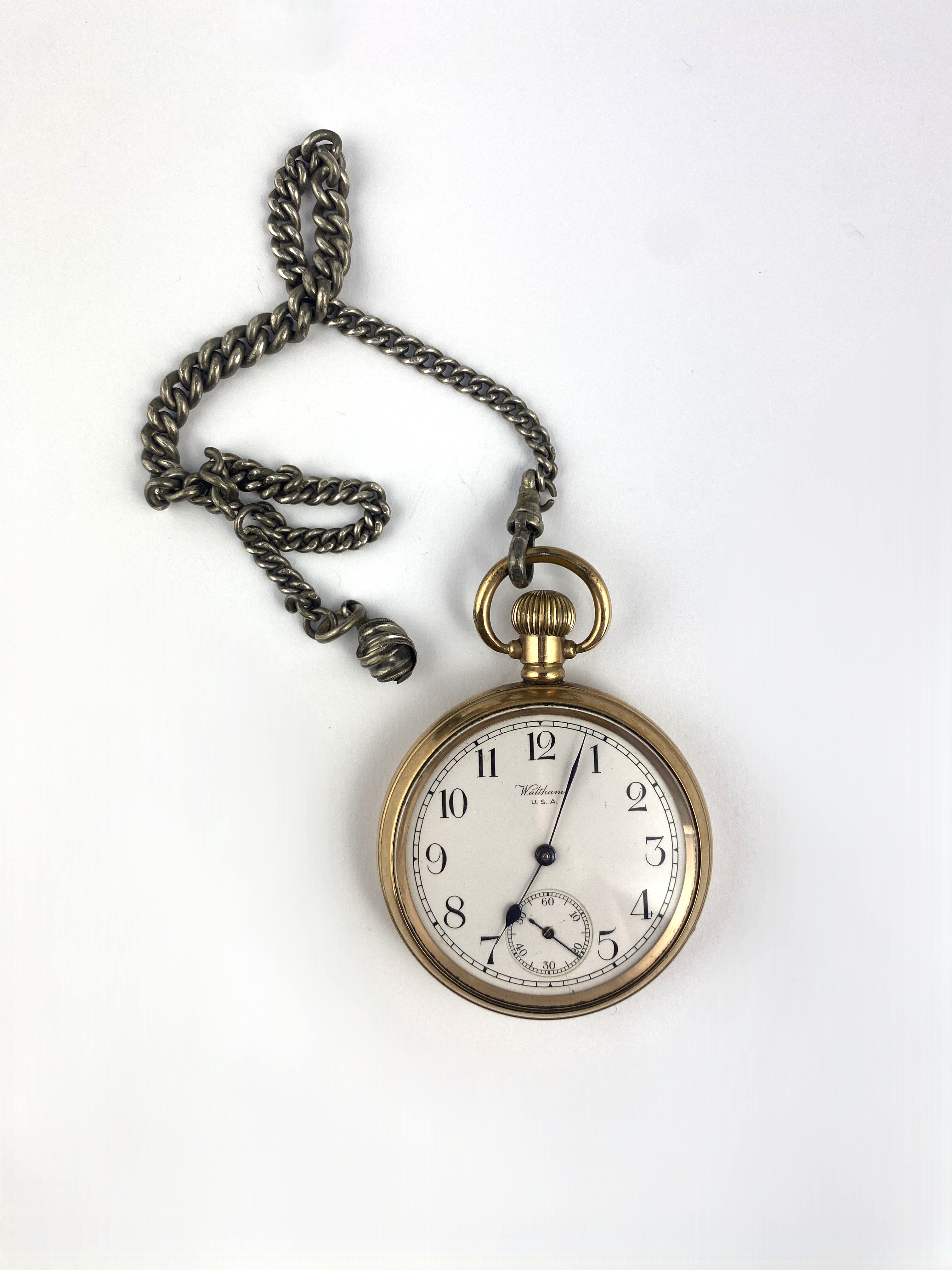A Waltham USA gilt metal cased keyless wind open faced gentleman's pocket watch, the movement numbered 27176614, with a graduated silver curb link watch Albert chain having a silver swivel