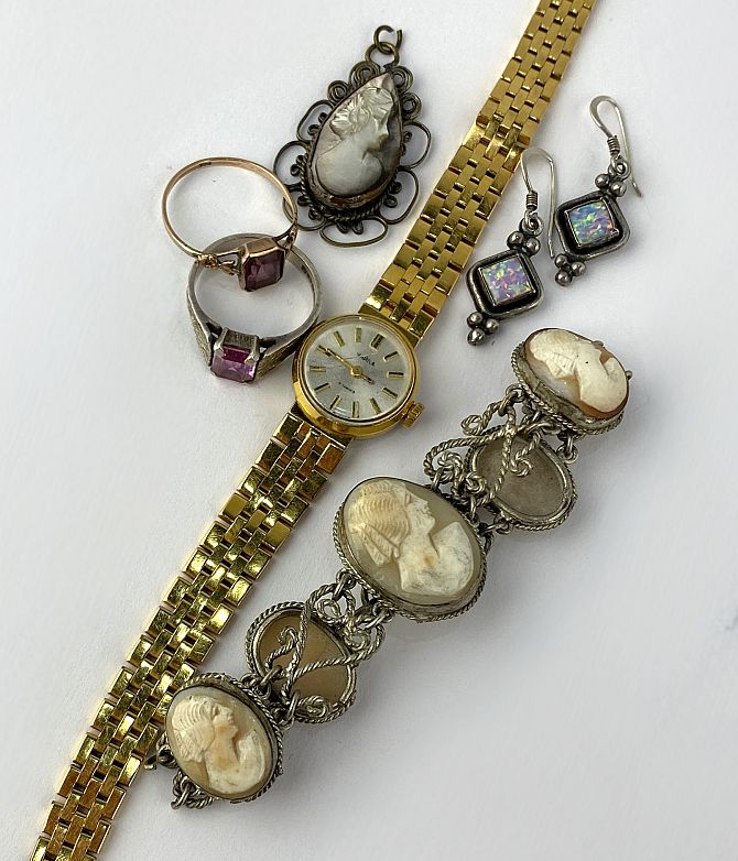 Six items of jewellery comprising of a gold and pink paste dress ring detailed 9ct gross weight 1g a silver and pink gem set ring a Russian gilt metal lady’s bracelet wristwatch a shall cameo linked bracelet a cameo pendant and a pair of synthetic opal earrings (6)