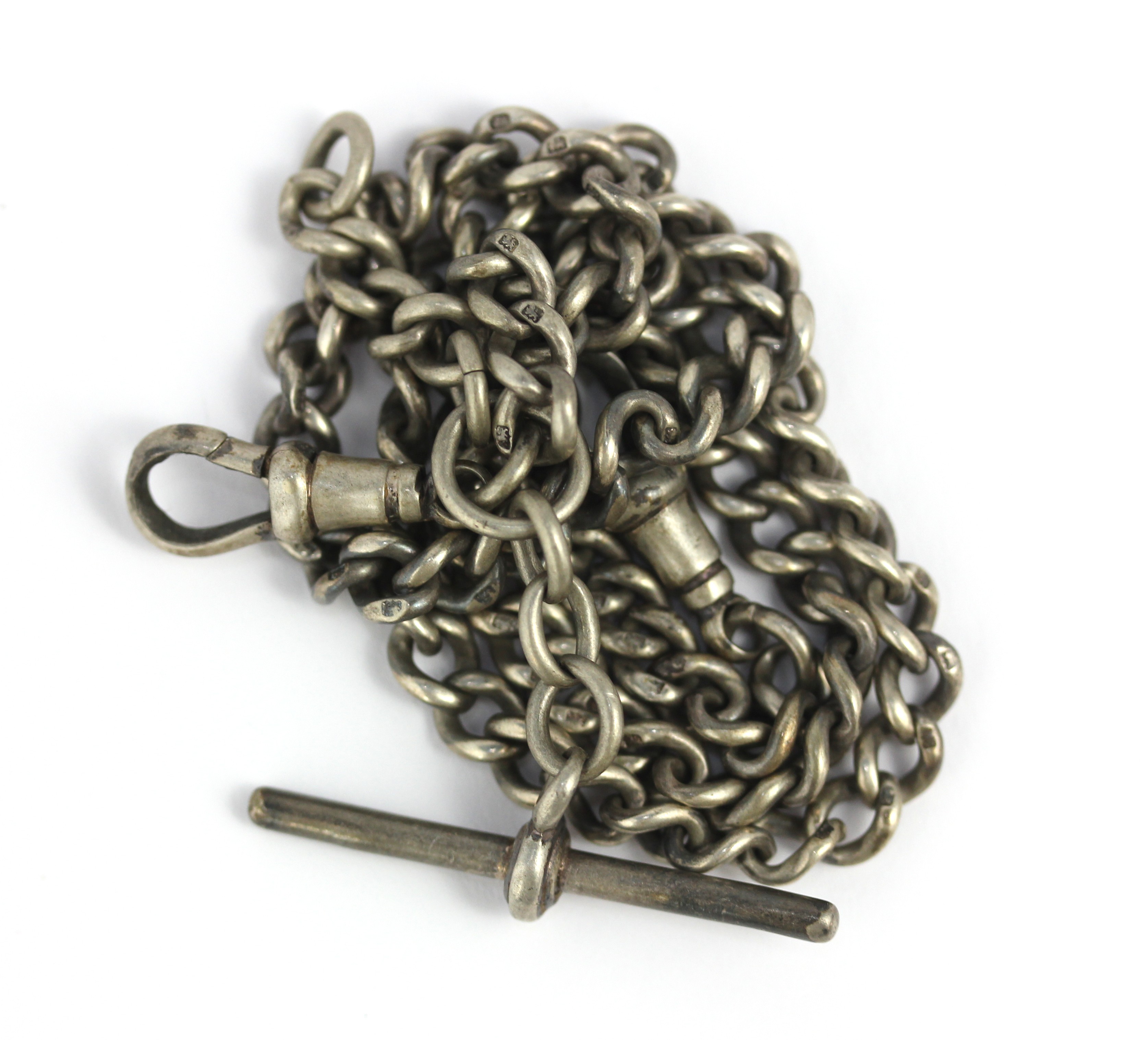A silver curb link gentlemans watch Albert chain fitted with a silver T bar and with two silver swivels, length 41.5cm including the swivel