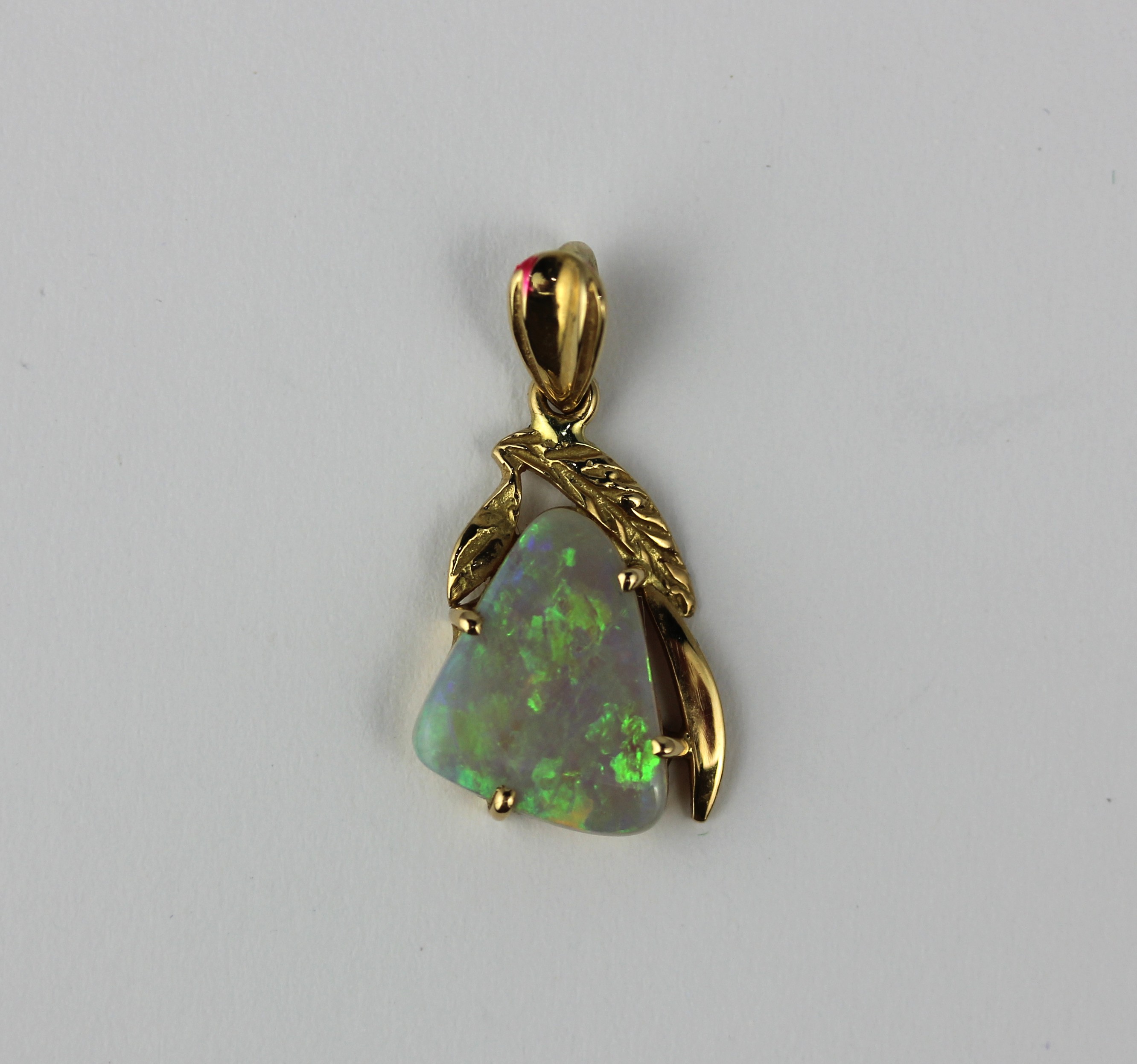 A gold and opal single stone pendant with a leaf form surmount detailed 750 gross weight 1.7g with a case