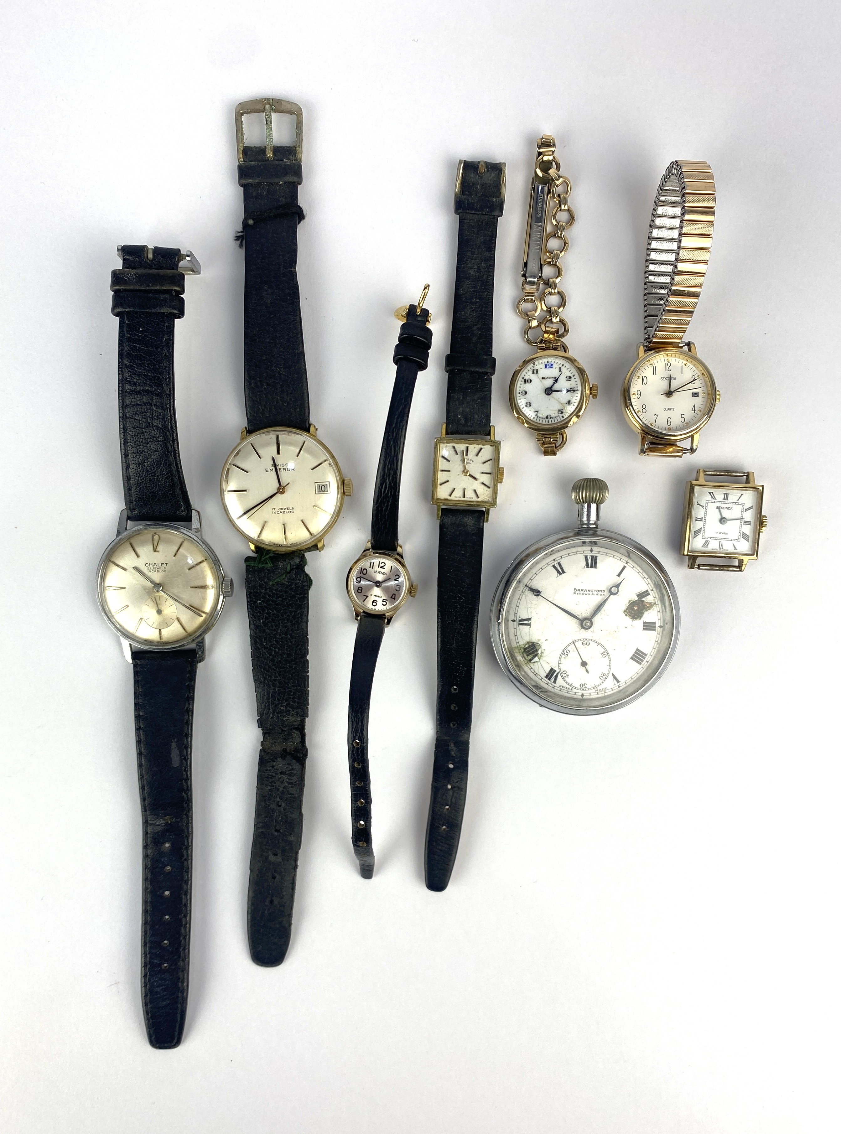 A group of watches comprising a Roamer 9ct gold cased ladies wristwatch on a gilt metal bracelet, four ladies wristwatches, two gentlemans wristwatches comprising Chalet and Swiss Emperor; also a Bravingtons Renown base metal cased gentlemans pocket watch