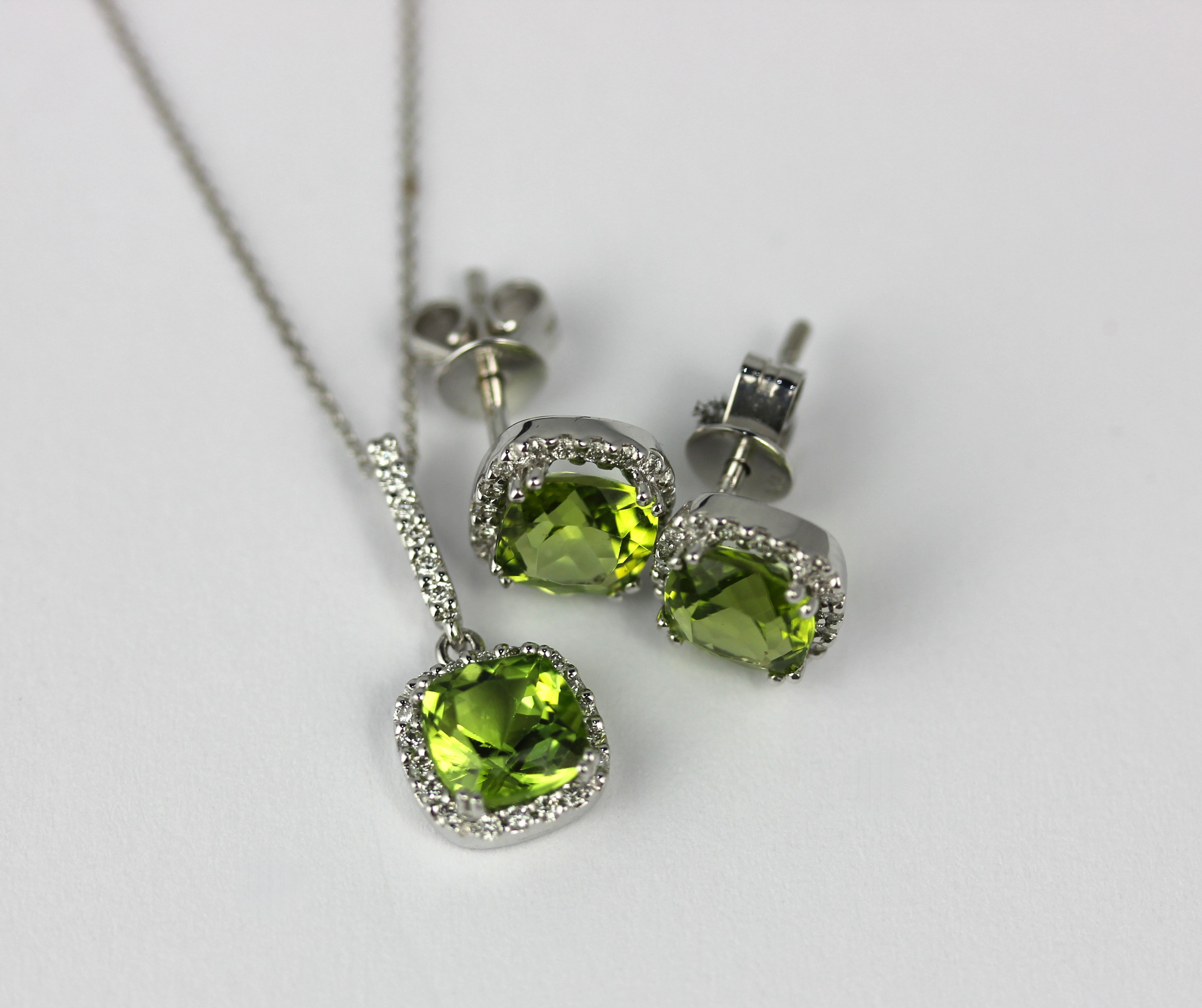 A group of peridot and diamond jewellery comprising a 9ct white gold peridot and diamond pendant with, a white gold neck chain detailed 375, a pair of 9ct white gold peridot and diamond ear studs with post and butterfly fittings combined weight 3.9g
