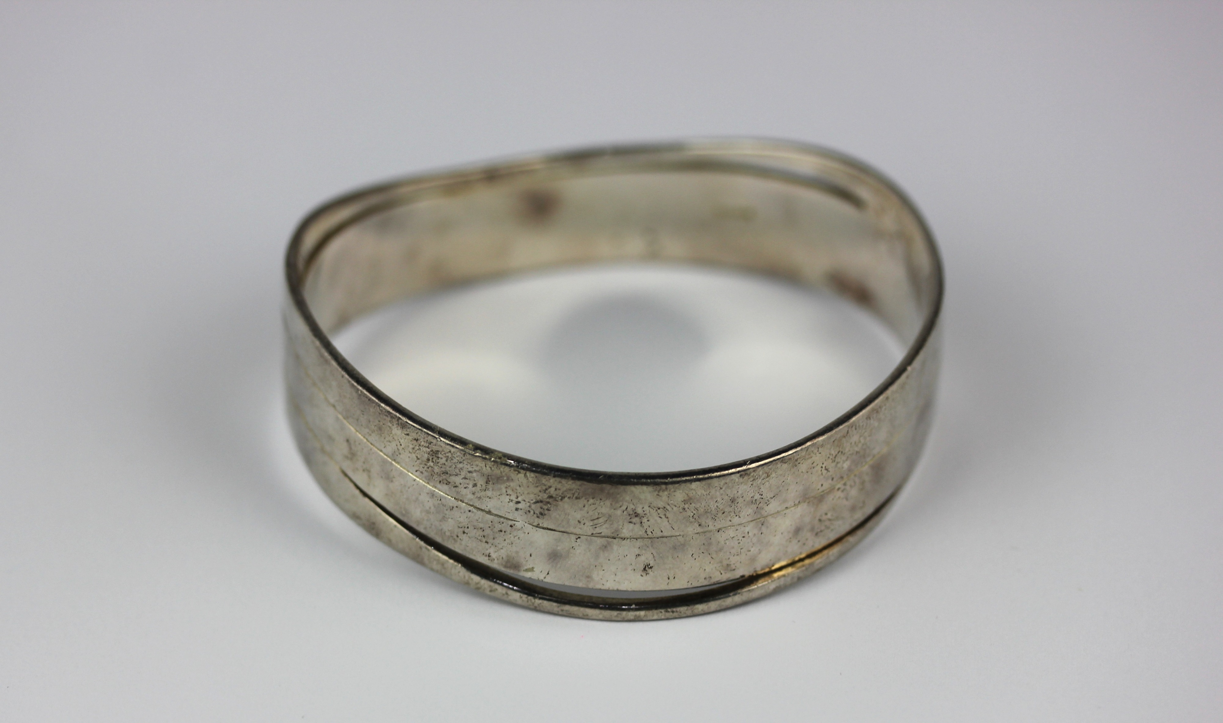 A silver bangle of curved abstract design detailed 925, 66g