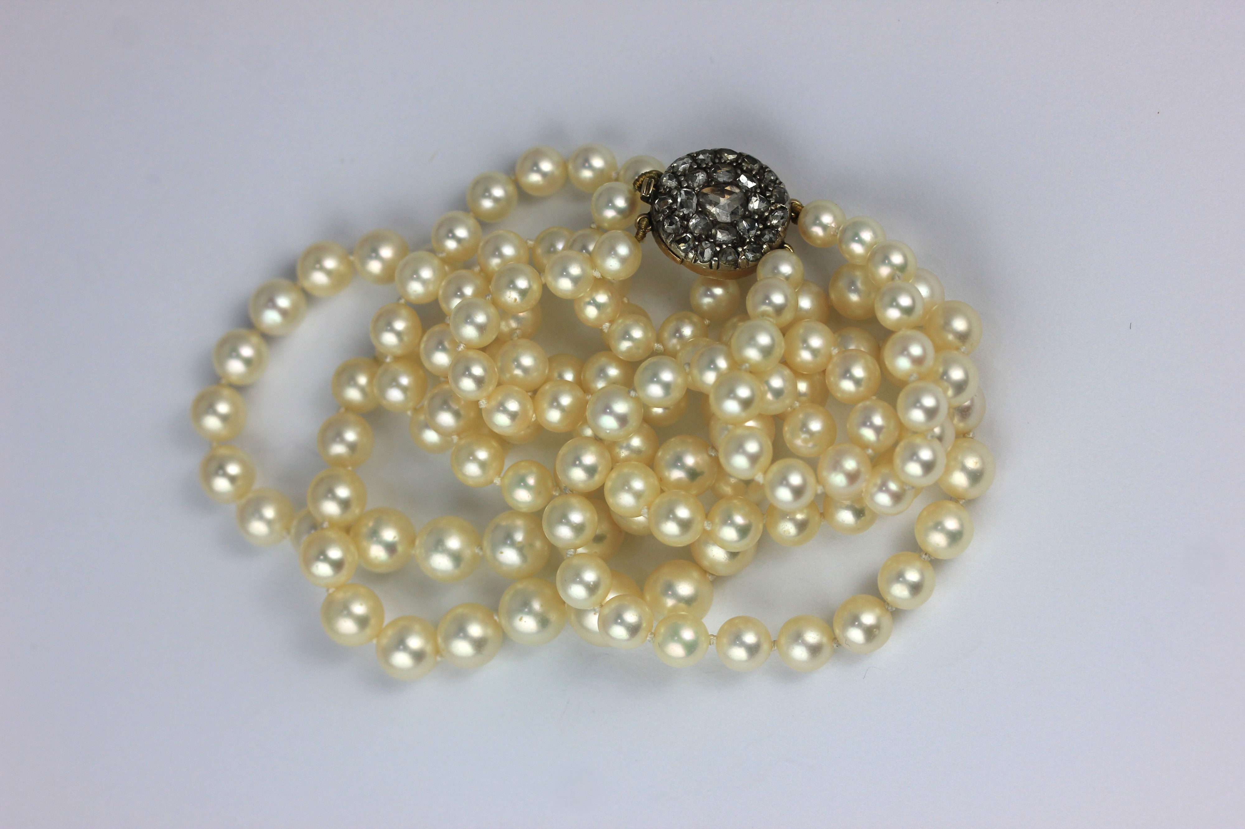 A two row necklace of graduated cultured pearls on a gold backed and silver set diamond clasp mounted with mostly rose cut diamonds, length 36cm